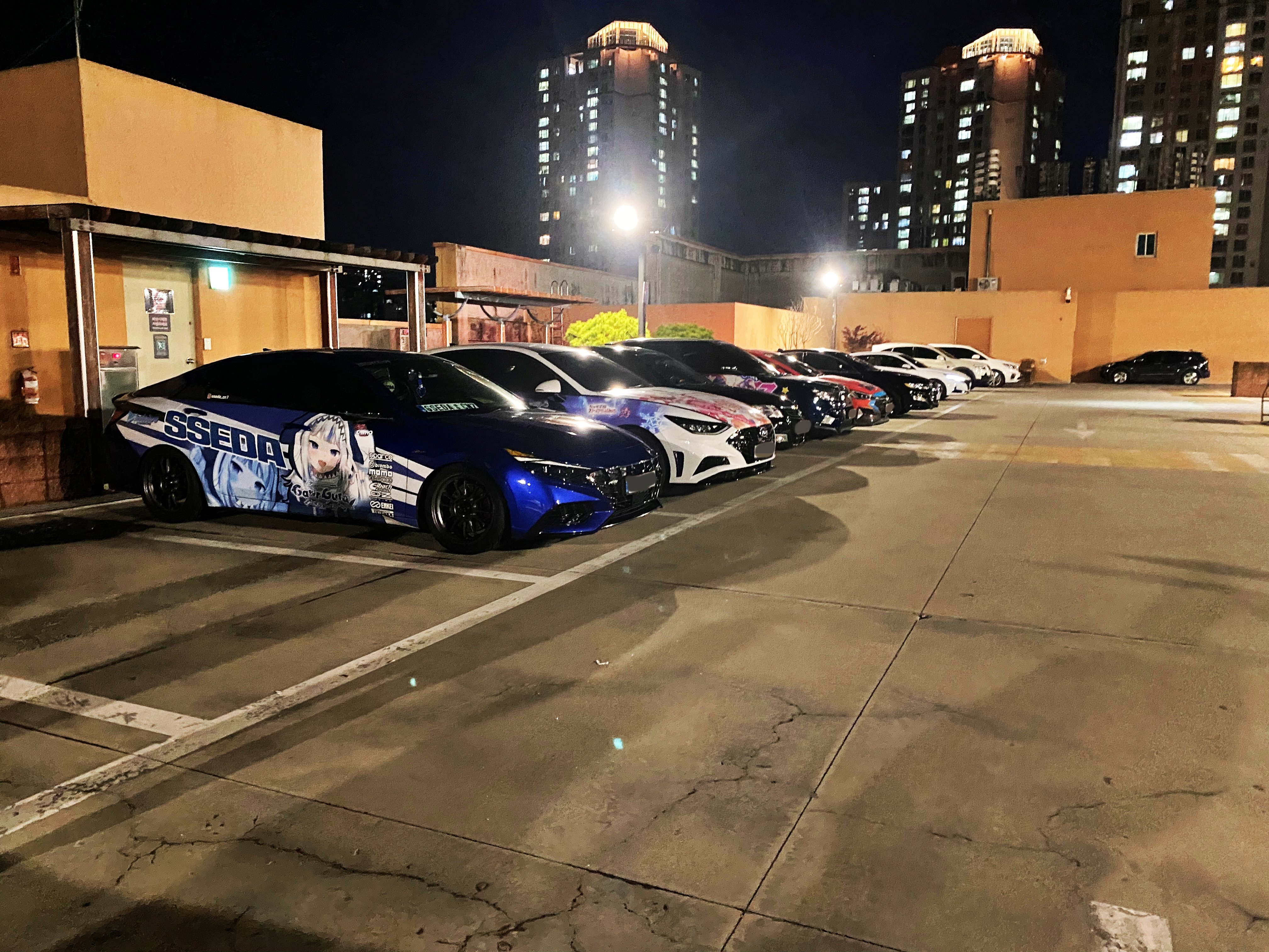 저도 약 한시간정도 늦게 도착했는데 그럼에도 6등이네요. 일요일 낮에 만났으면 더 좋았을텐데 오히려 일요일에 일을 하러 가시는 분들도 계셔서 최적의 시간은 토요일 오후로 잡혔습니다. 무엇보다도 이날 화제가 되었던 차량은 아반떼 CN7 N라인에 작업된 홀로라이브의 가우르 구라 이타샤였습니다.