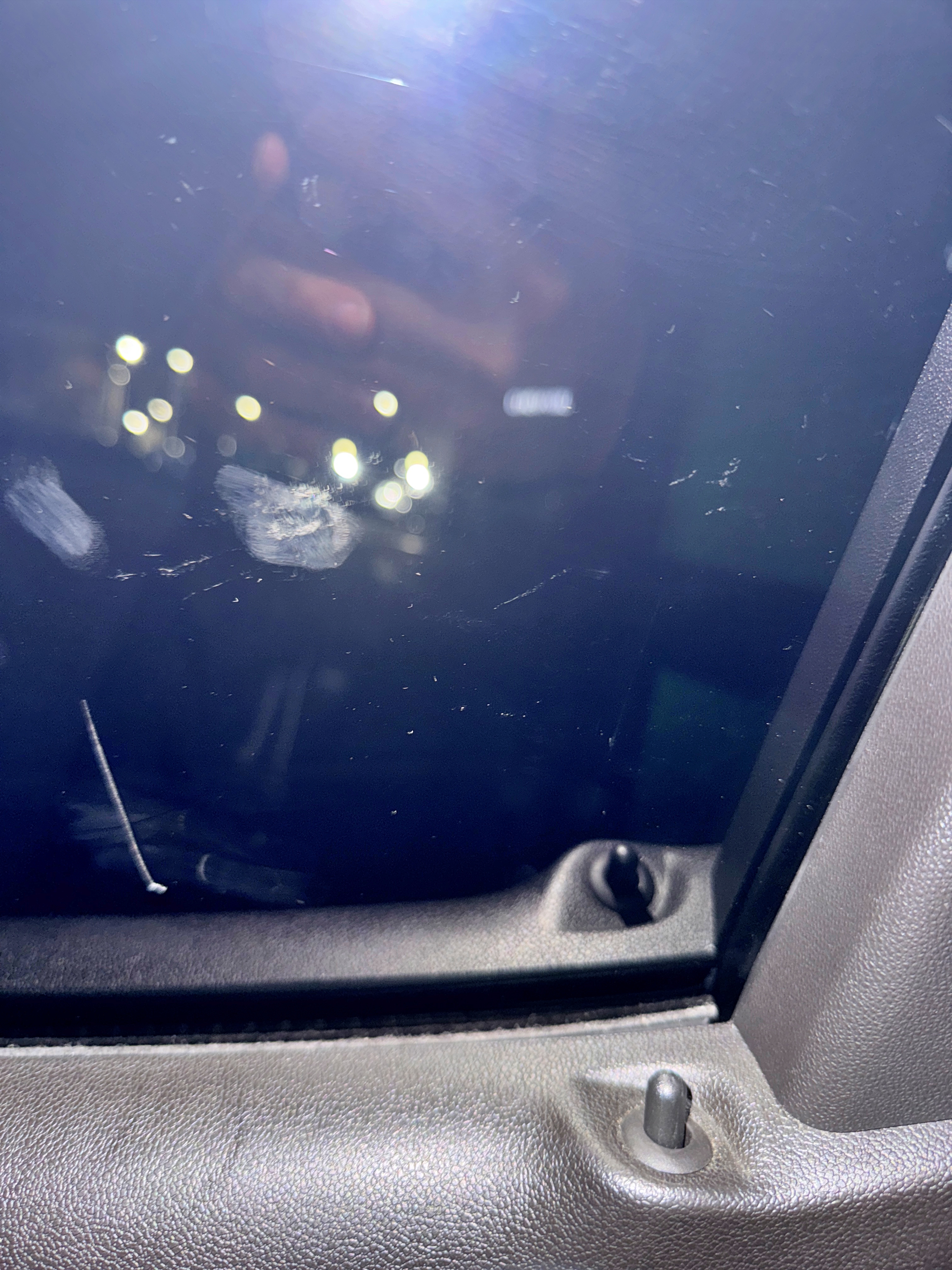 이건 누가 봐도 수리를 위해 유리를 탈착 해둔 뒤 다시 끼우는 과정에서 발생한 데미지입니다. 그냥 조금 긁혀서 썬팅만 새로 하면 될 부분이라면 뭐 그냥 넘어가겠습니다만, 저 큰 흠집은 깊숙이 긁혀있네요. 차를 고치러 갔다가 오히려 멀쩡했던 부분이 망가져 있는 상태였습니다.