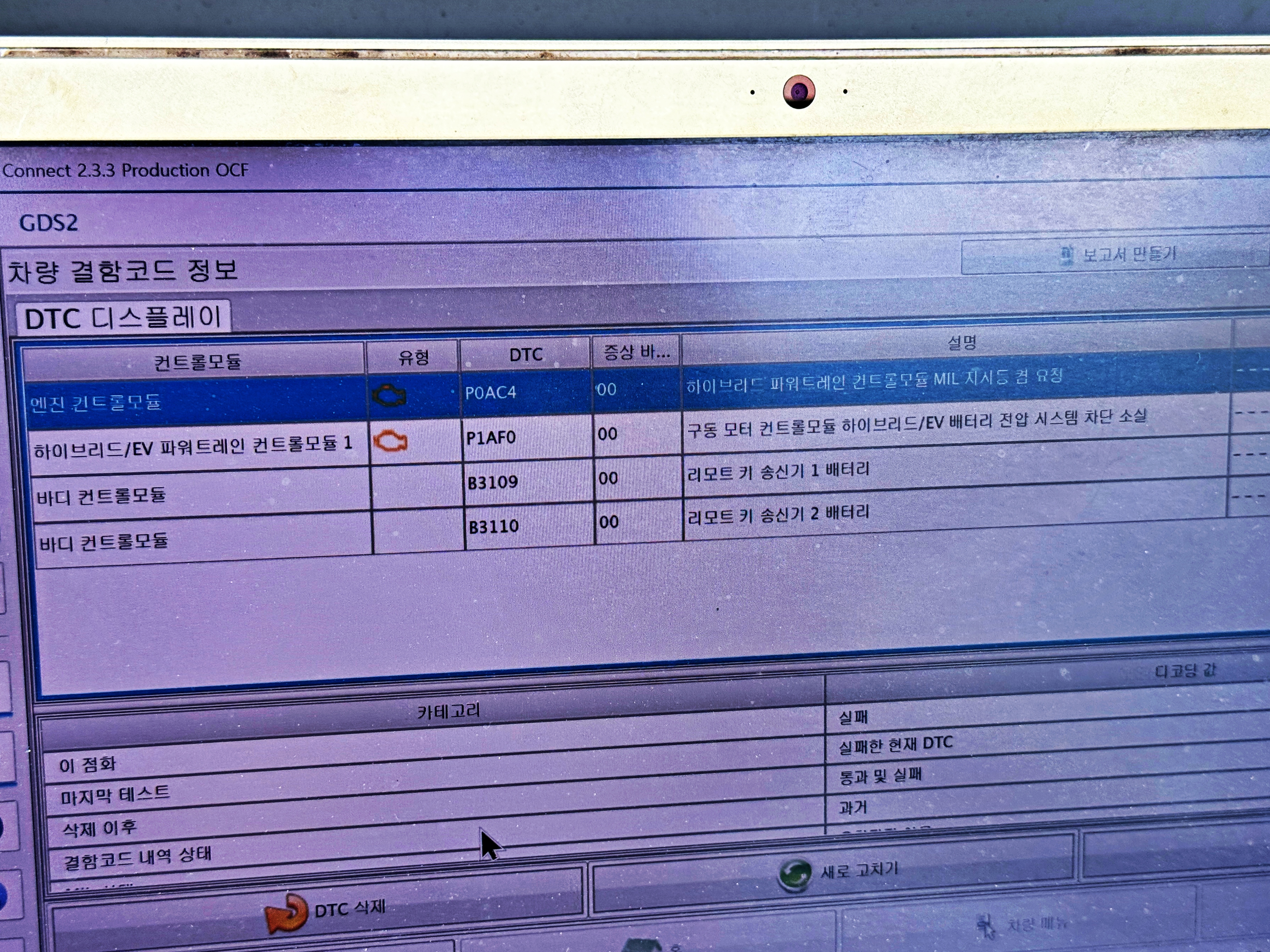 노트북과 차량의 OBD를 연결하여 고장코드를 확인합니다.