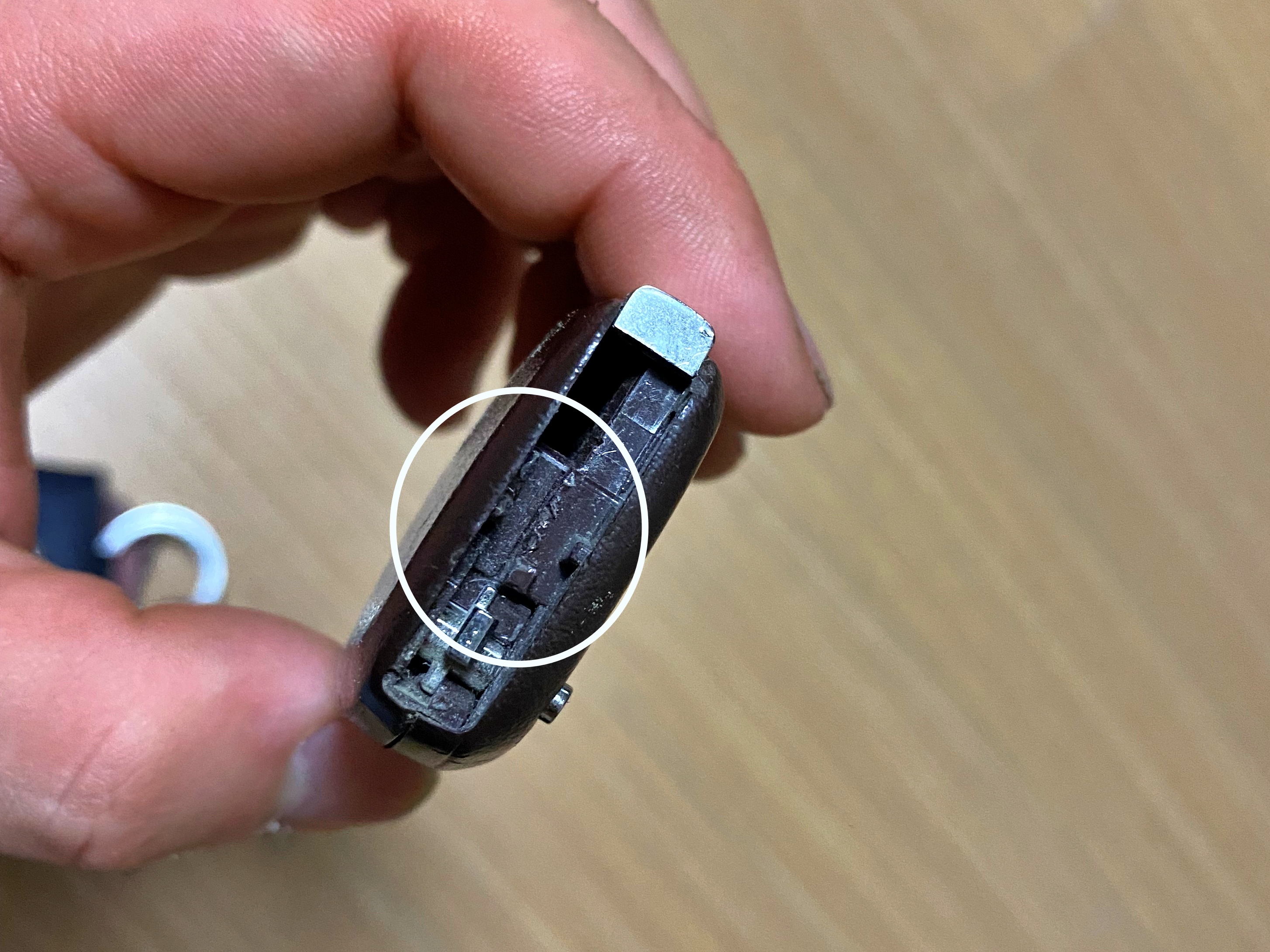 키 하단의 열쇠를 제거해주시면 저런 작은 홈이 나타납니다. 일자드라이버나 헤라를 넣고 돌려주시면 키가 벌어집니다. 정 그런 물건이 없다면, 리모컨에서 분리한 키를 사용해도 됩니다. 벌어진 스마트키를 분해하면 기판이 나오고, 그 기판까지 들어내면 배터리가 보일 겁니다.