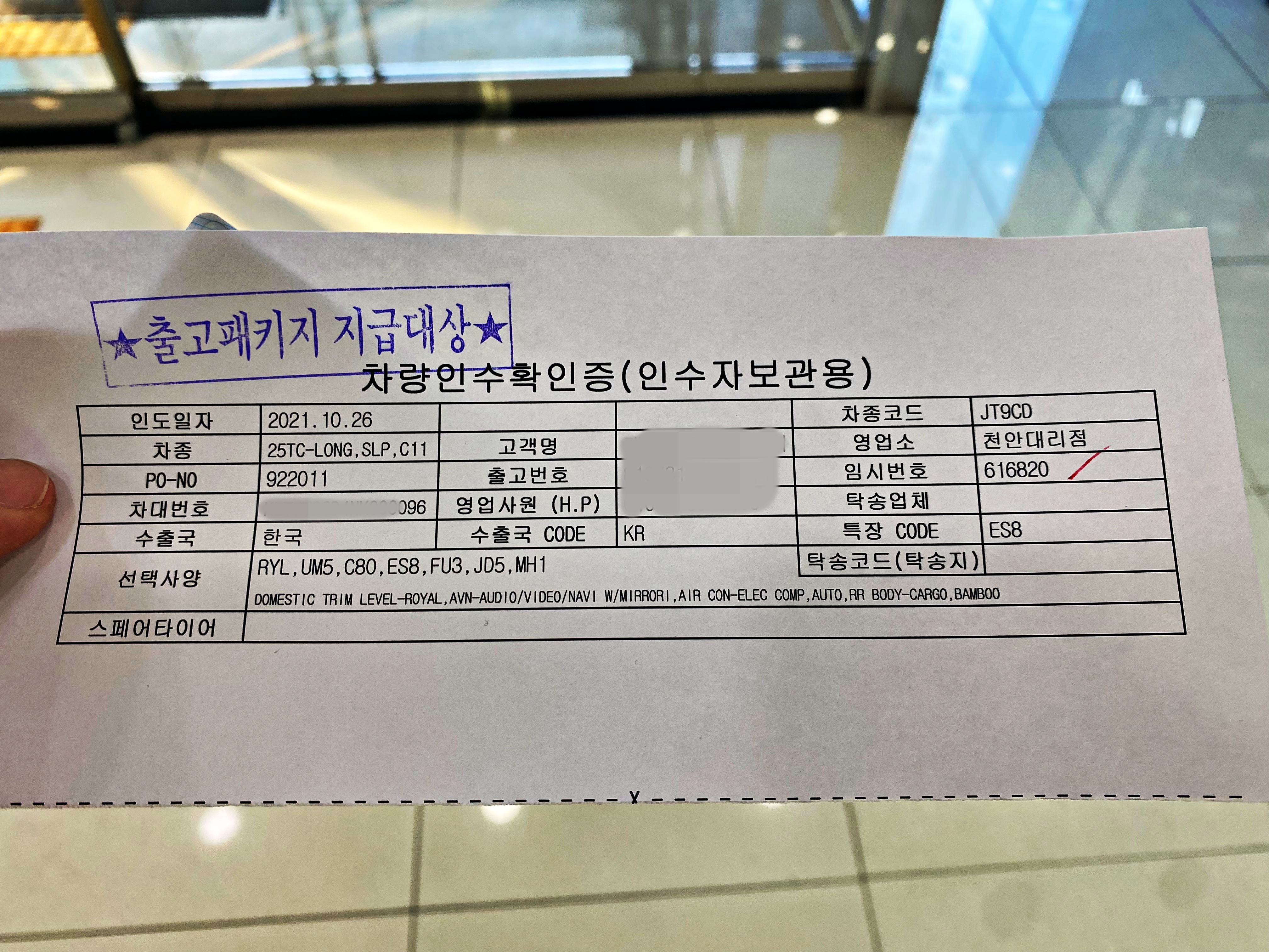 이 종이를 들고 교육장과 휴게실이 있는 2층으로 가서 기다리면 10시쯤 교육이 시작된다고 합니다. 차대번호는 96번. 임시번호판과 함께 인도일자는 21년 10월 26일로 나와있네요. 월요일 오후에 계약금을 넣었고 화요일에 최종적으로 대출까지 받았으니 미리 나와있다고 보는게 맞을겁니다.