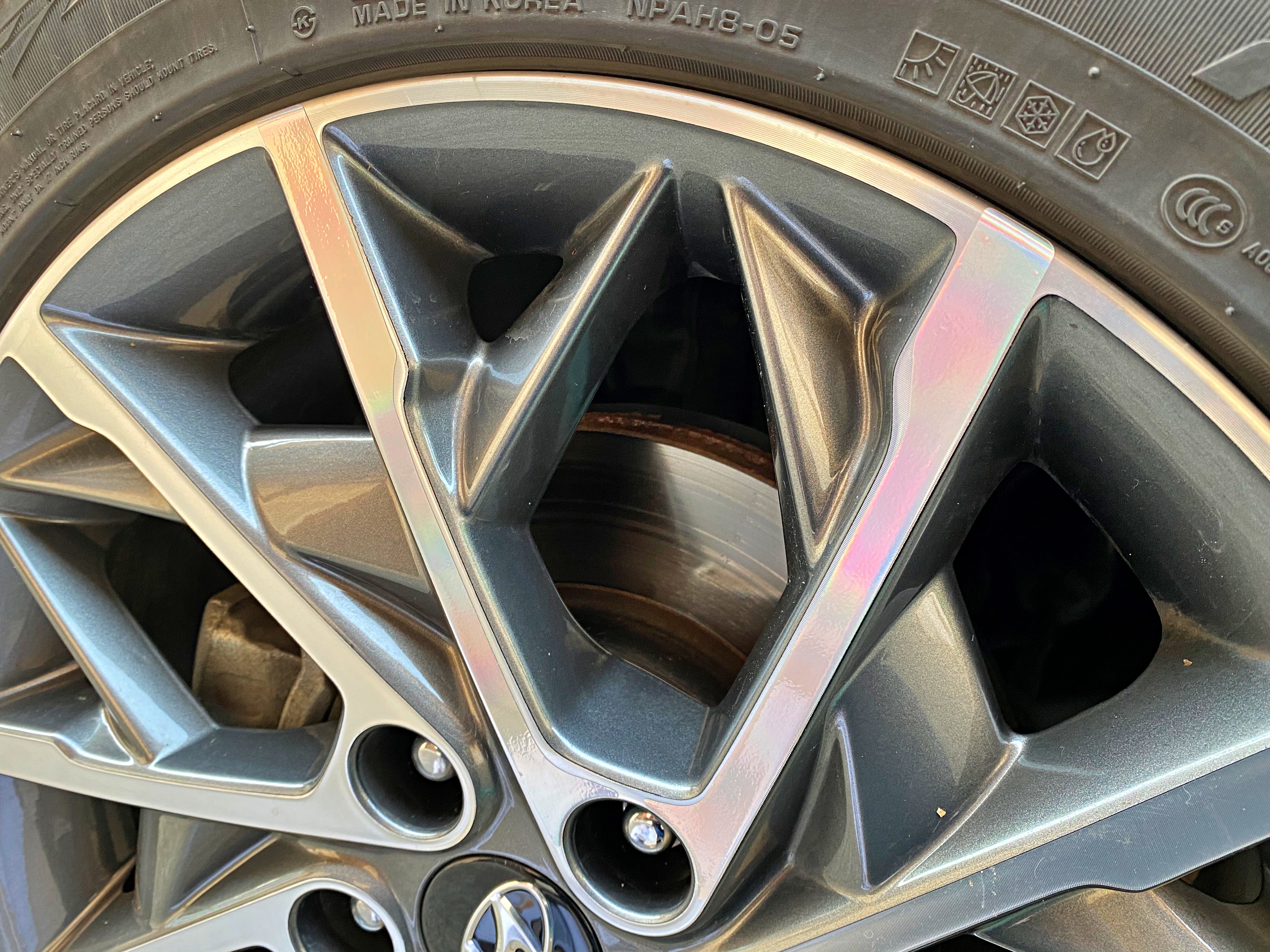 호롱호롱한 홀로그램 빛이 비칩니다. 휠 볼트 구멍 자리에 맞추고 스티커를 붙여줬는데 내내 같은 사이즈여도 제가 잘 못 붙이는 건지 붙이다 보니 크기가 들쑥날쑥으로 느껴지더군요. 그래도 아주 가까이 가서 보지 않는 이상 크게 티도 나지 않으니 상관은 없습니다.