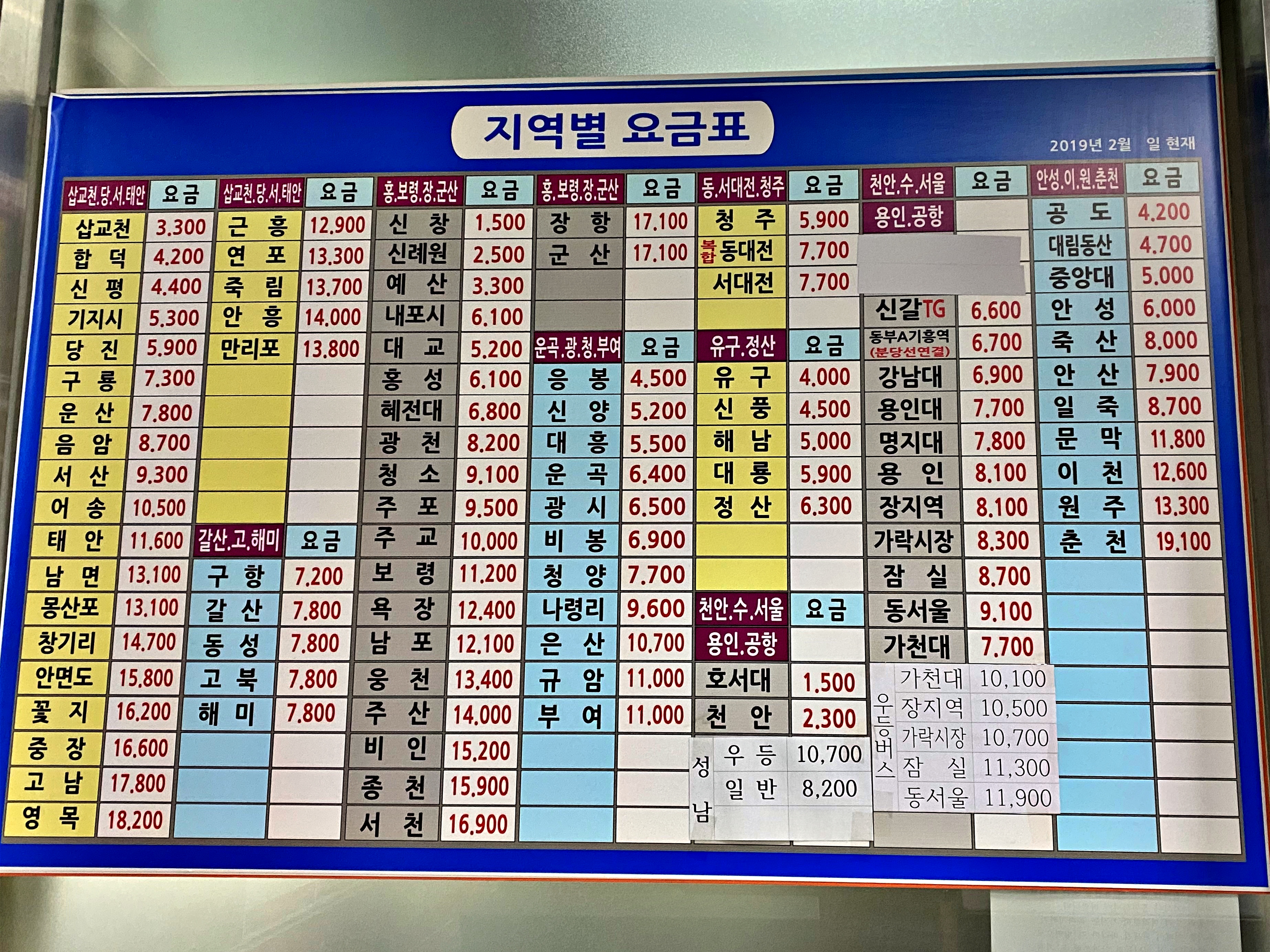 지역별 노선별 요금표입니다.