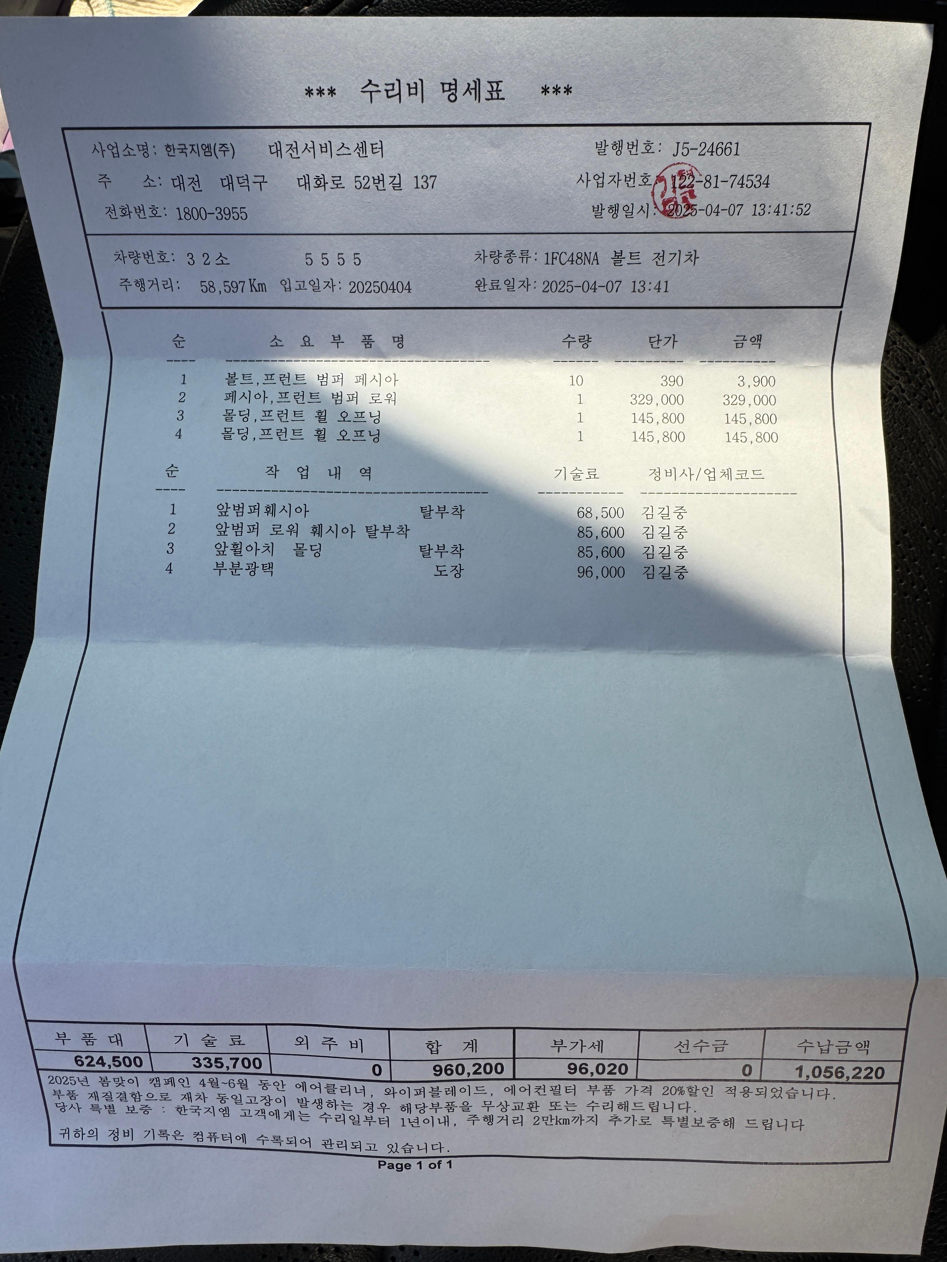 그렇게 차량 수리를 보낸지 만 4일차 되는 날 수리가 끝났다는 연락을 받았습니다. 수리가 완료된 제 차를 찾을 때는 시간이 애매하여 렌터카 사무실에서 직접 차를 가지고 올라오시고 대차를 회수해갔네요.