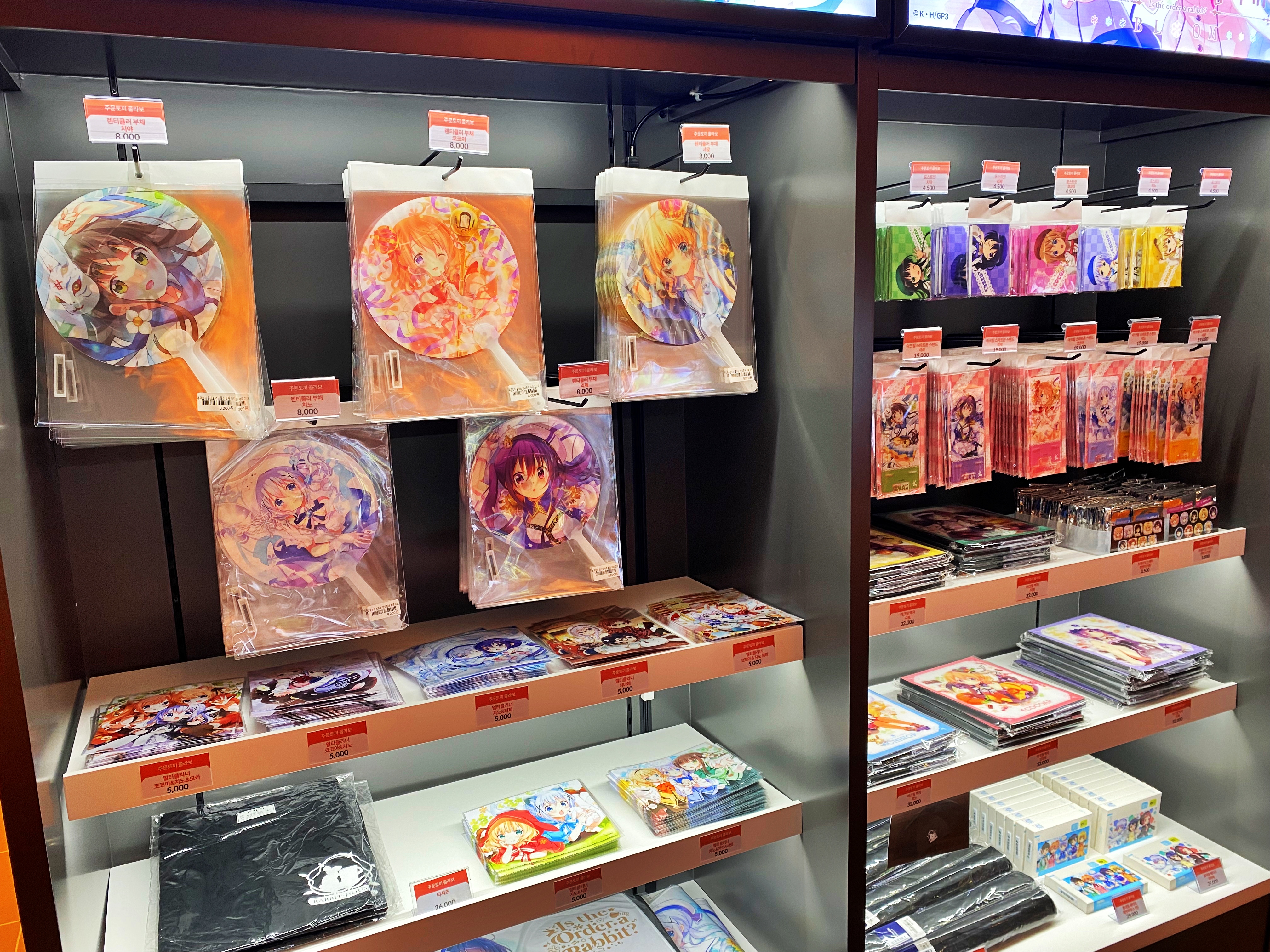 주로 뱅드림!, 러브라이브 시리즈 관련 굿즈들이네요. 인기도 좋고, 팬들의 충성도도 매우 높은 축에 속합니다. 당연히 정품이고, 가격은 오프라인임에도 그렇게 비싸다고 느껴지지는 않네요. 중간중간 다른 작품들의 굿즈도 보입니다만, 콜라보중인 주문토끼나 방금 언급했던 두 작품 관련 굿즈가 대부분입니다.