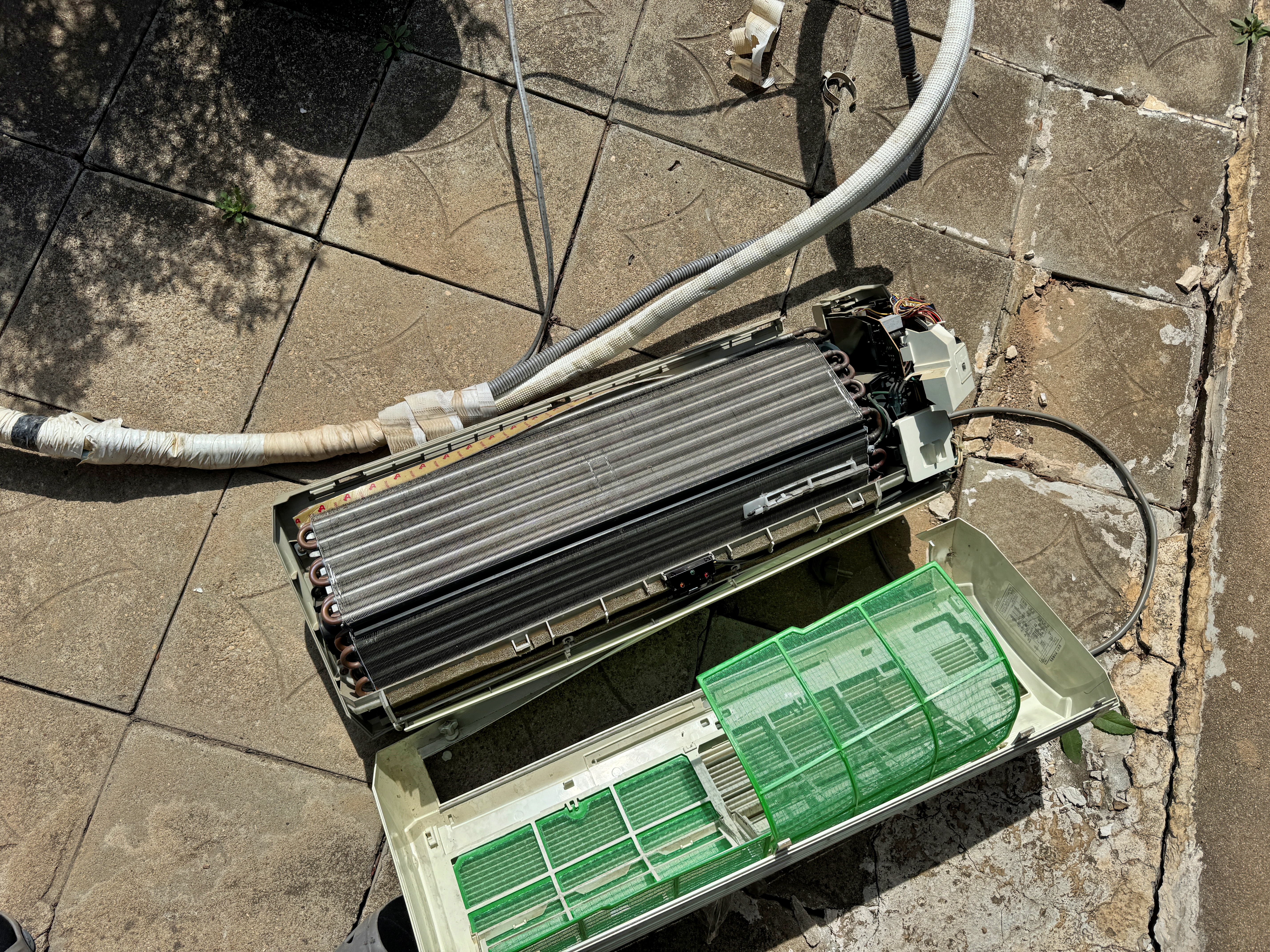 동파이프가 타공된 부위에서 꺾여 들어가진 않아서 그냥 밖에서 잡아당기니 쉽게 빠지는군요. 여기까지만 마무리해도 됩니다만, 저는 이 에어컨에서 얻을 수 있는 자원을 최대한 얻기 위해 실내기와 실외기를 분해한 뒤 자원별로 분리하려 합니다.