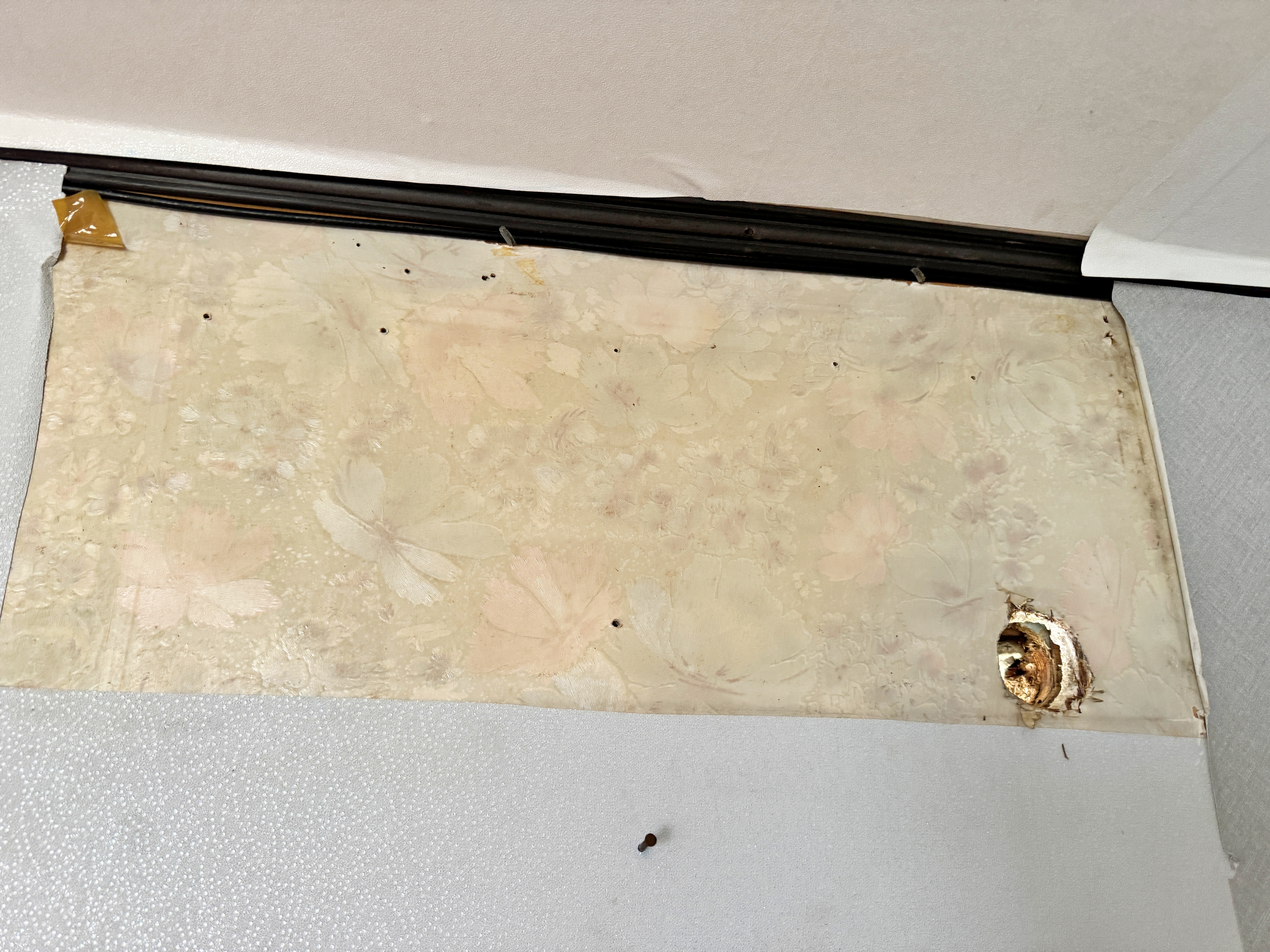 우측 끝에 파이프를 넣기 위해 타공했던 자리가 보이네요. 보기 그렇다면 신문지를 넣거나 테이프를 붙여 막아주면 됩니다. 이 상태로 며칠 놔둔 뒤 에어컨 설치가 진행되었습니다.