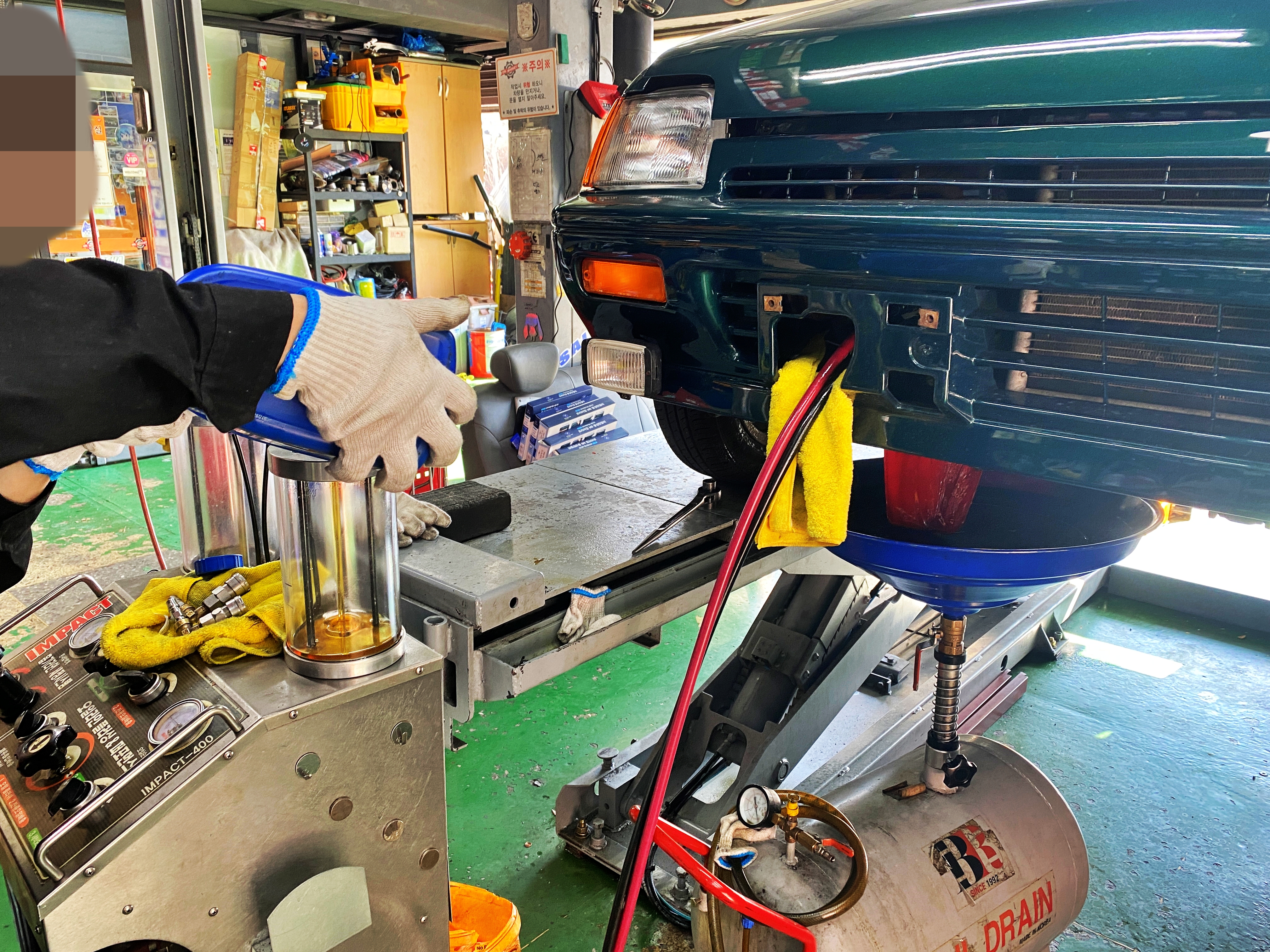잔유의 완벽한 제거를 위해 저렴한 엔진오일을 세척유로 조금 밀어 넣고 다시 드레인 해줍니다.