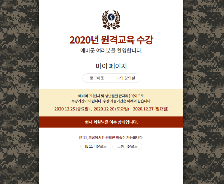 2020년 예비군 훈련은 취소 및 이수처리되었습니다. 그리고 지난번에 문자가 와 미리 예비군 원격교육 홈페이지에 가입을 했었는데, 그새 로그인 방식이 변경되었더군요. 괜히 가입했습니다. 여튼 남들은 모텔가서 놀고있는 25일 크리스마스에 예비군 원격교육 수강일이라는 문자가 왔더군요.