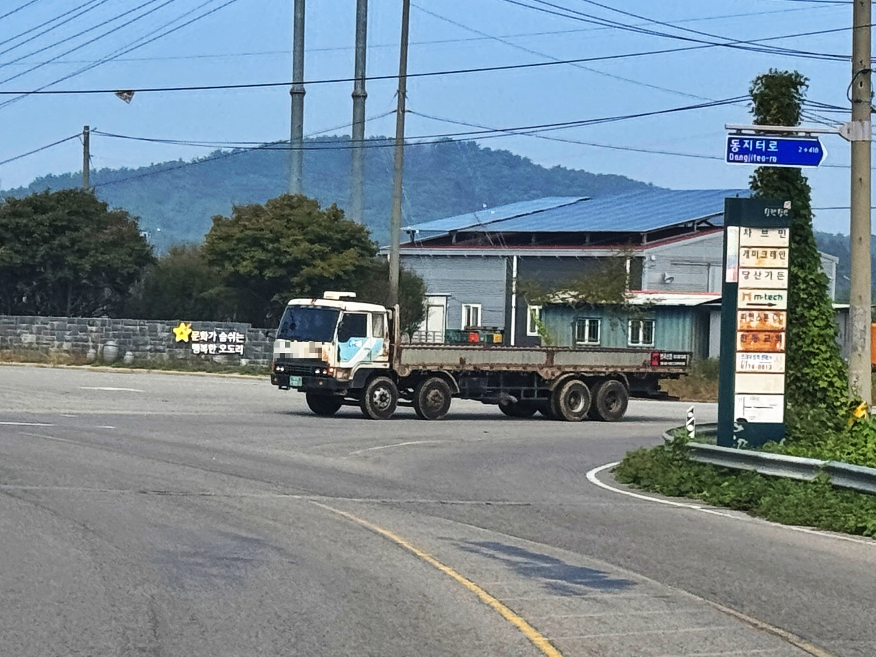 85년부터 97년까지 생산되었던 기간 중 문짝의 도색 및 데칼 디자인의 형태로 초기 중기 후기형을 나누자면 이 차량은 91년 이후의 요소가 반영된 중기형 차량입니다. 이전에 다뤘던 18톤 차량은 3색의 라인이 날아가는 느낌의 데칼이 적용되었고, 이 차량에 적용된 형태의 도색은 이후 하위 라인업인 포터와 마이티에도 영향을 미쳤었습니다. 30년의 세월이 무색하게 2024년 가을의 도로를 달리고 있었습니다. 아주 건재한 모습으로 말이죠.