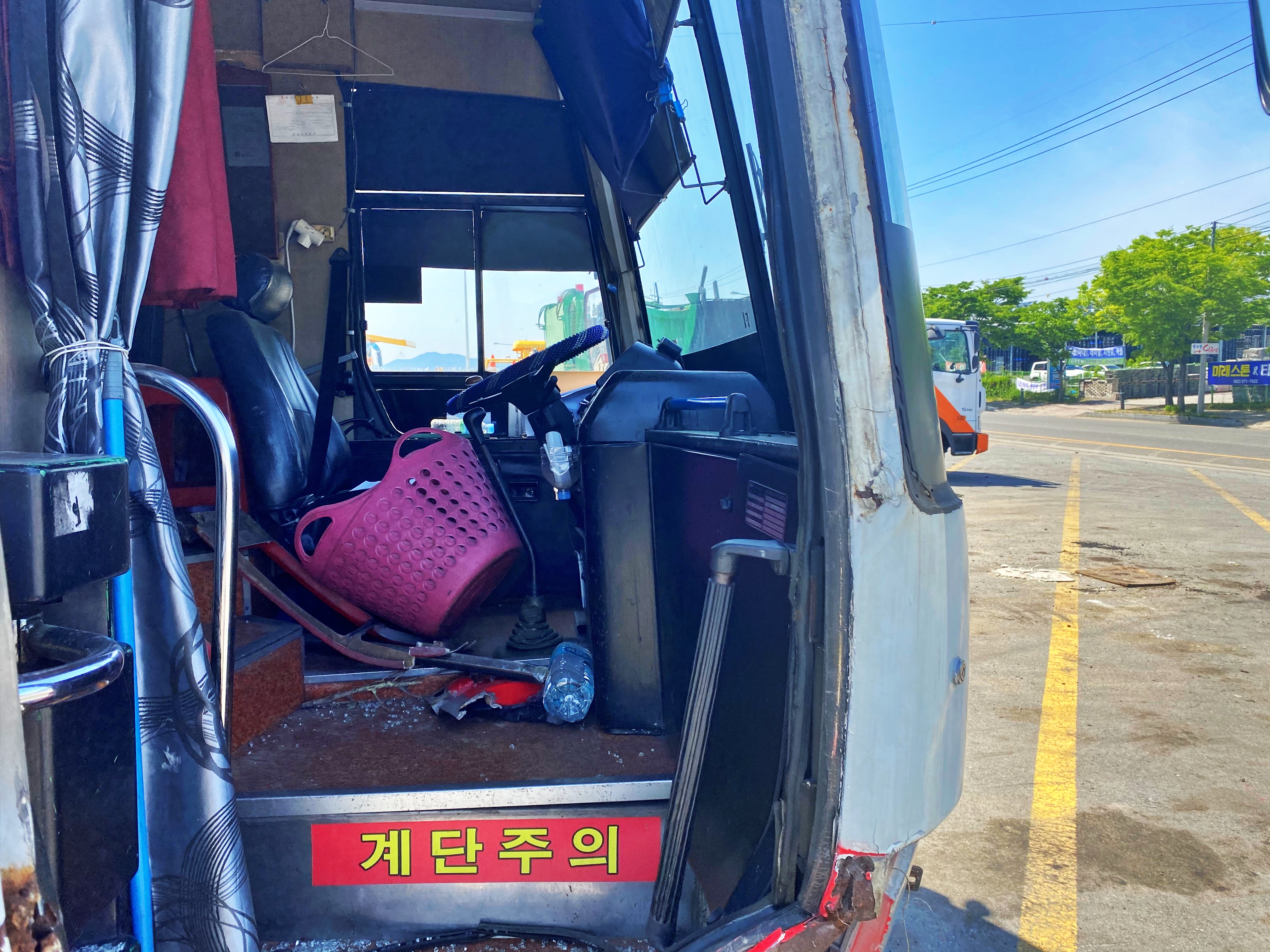 망가진 상태 그대로 세워져 있습니다. 당연히 부품도 없겠죠. 일반적인 승용차 부품 구해서 고치기보다도 어려우리라 생각됩니다. 그렇게 폐차될 날만 기다리고 있는 것인지.. 수리 예정이라는 A4용지 한 장 붙은 거 말곤 별다른 차량 상태에 대한 안내는 없었습니다.