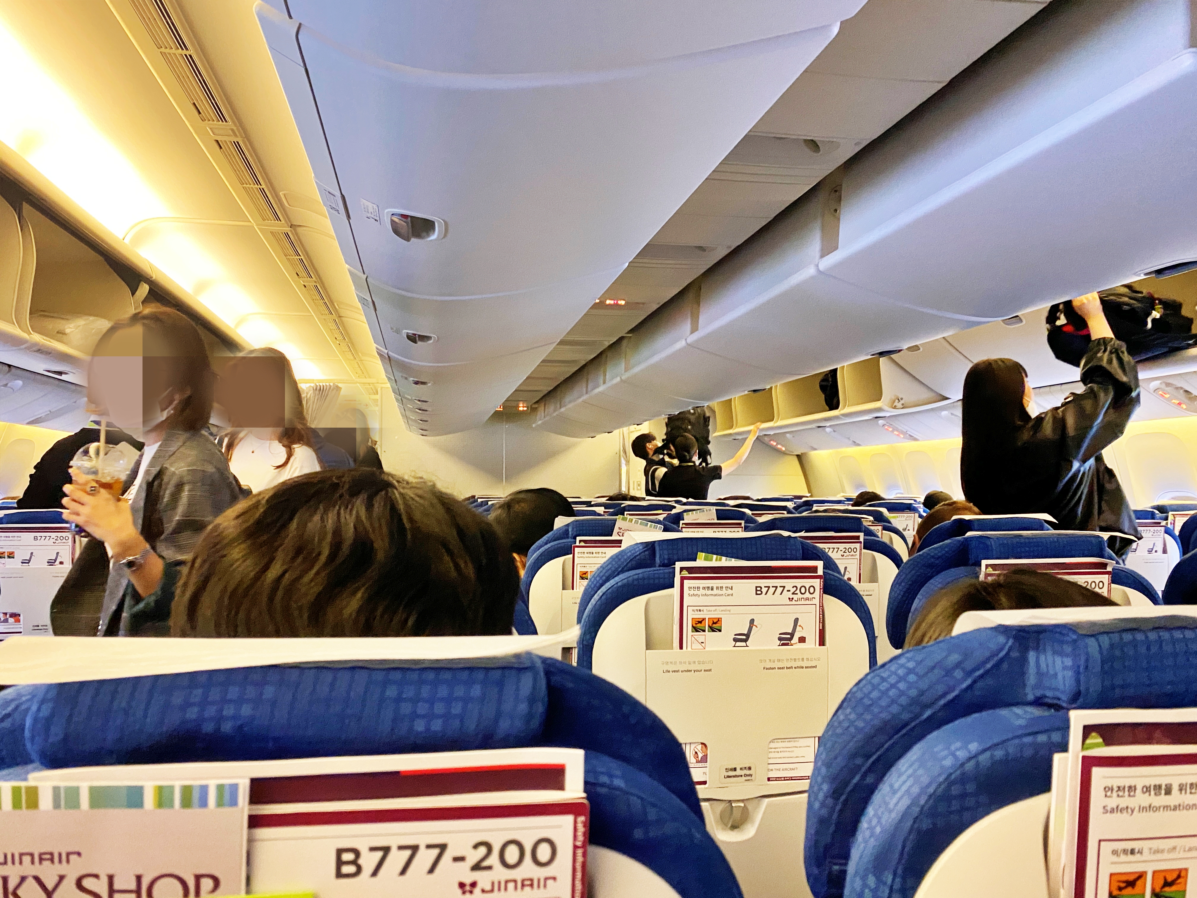 이번에는 가운데 좌석으로 앉아봅니다. 불과 일주일 전에는 좌석을 가득 채워서 이륙했는데, 드문드문 빈 좌석들이 보이기도 하네요. 당연히 탑승객은 90%가 한국인. 빈자리가 드문드문 보이고 일본인 비중이 줄어든 것으로 일본의 새 학기가 시작된 여파도 꽤 크리라 생각됩니다.