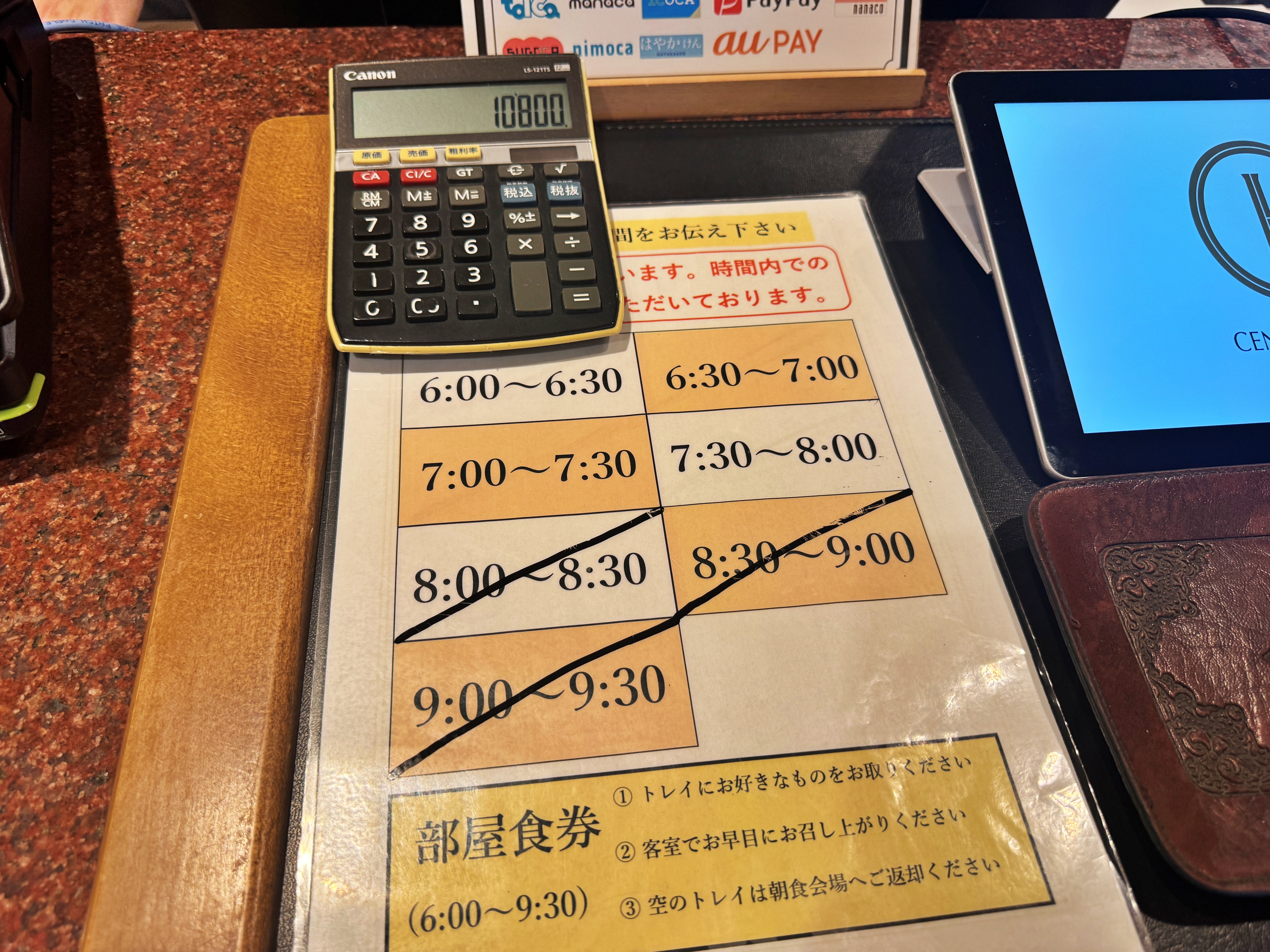 카드나 현금 모두 가능합니다. 다만 이 호텔은 로비 옆 식당의 규모가 크지 않아 식사시간을 30분 간격으로 나눠놓고 식권을 발부하고 있었습니다. 그러니까 한꺼번에 사람이 몰리는 것을 방지하려는 목적이겠죠. 줄이 그어진 시간대의 경우 이미 식권이 소진되었다는 이야기입니다.