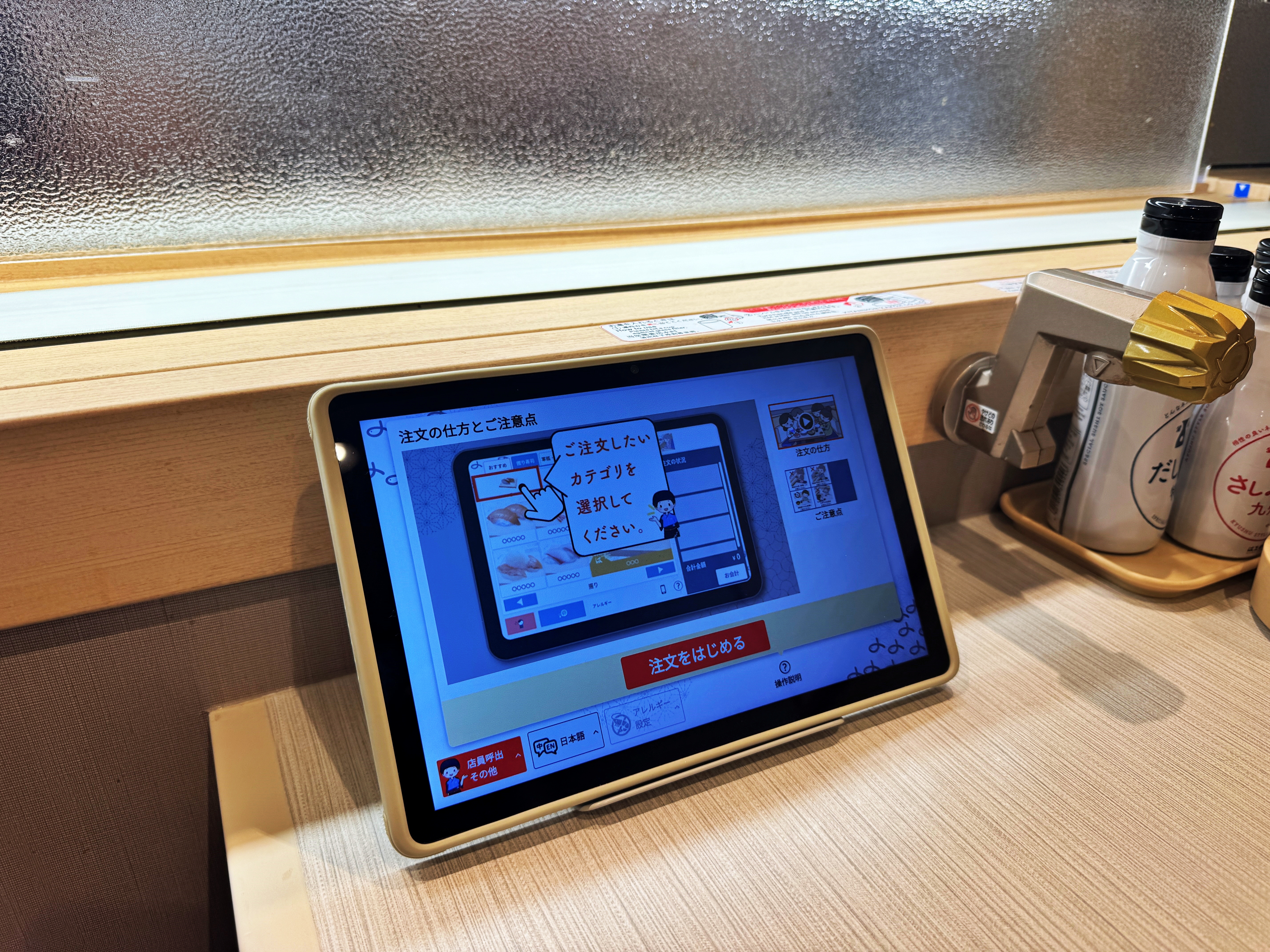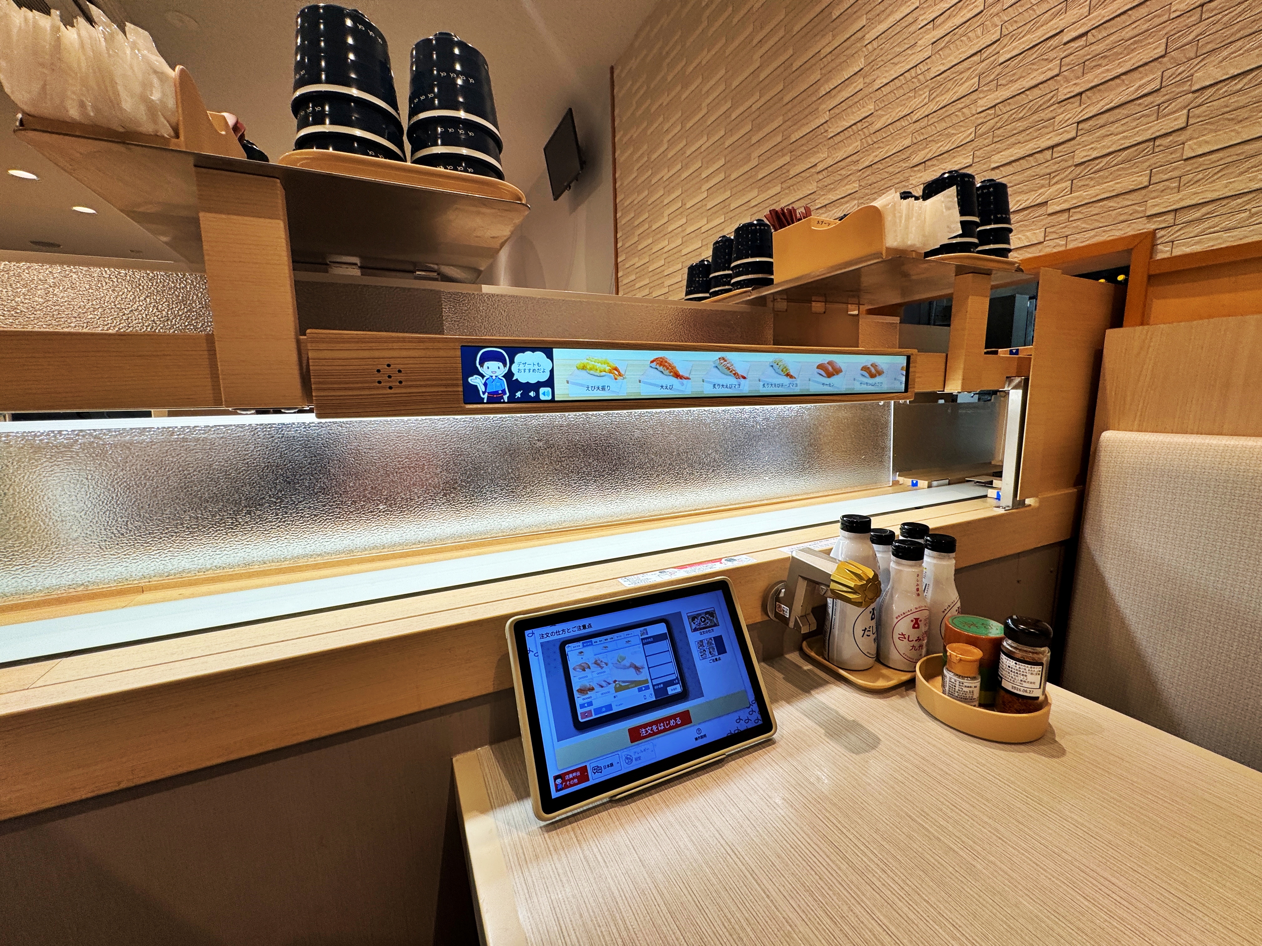 테이블의 태블릿 말고도 레일 위에 보이는 액정으로도 주문이 가능합니다.