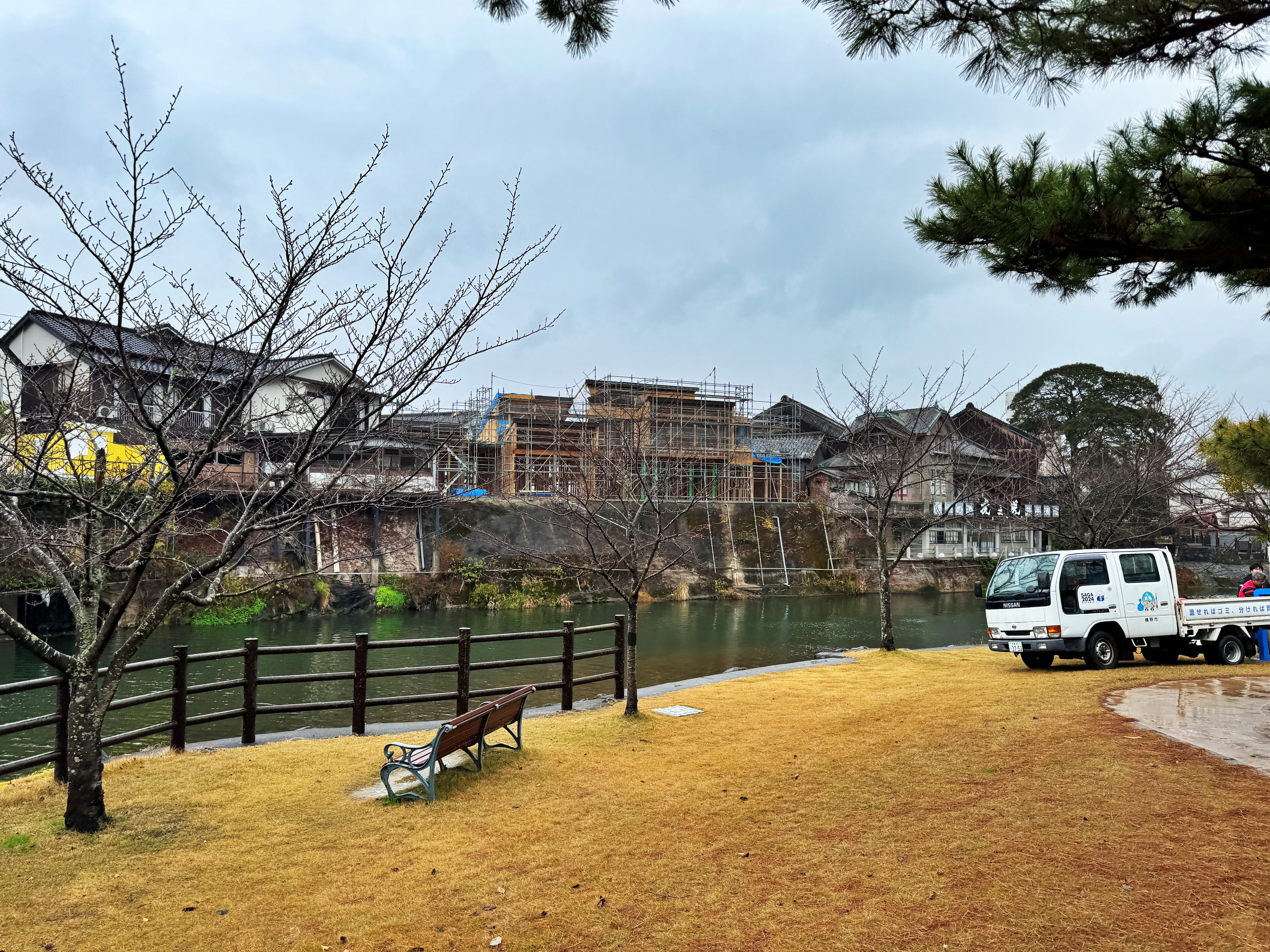 맞은편 우레시노공원에서 열심히 캐노피 텐트를 설치하고 계신 공무원 아저씨들의 작업도 막바지인가 봅니다. 신유광장은 강 건너편 공원만큼 아름답지는 않지만 시볼트노유를 배경으로 사진을 촬영하기에 좋은 곳입니다.