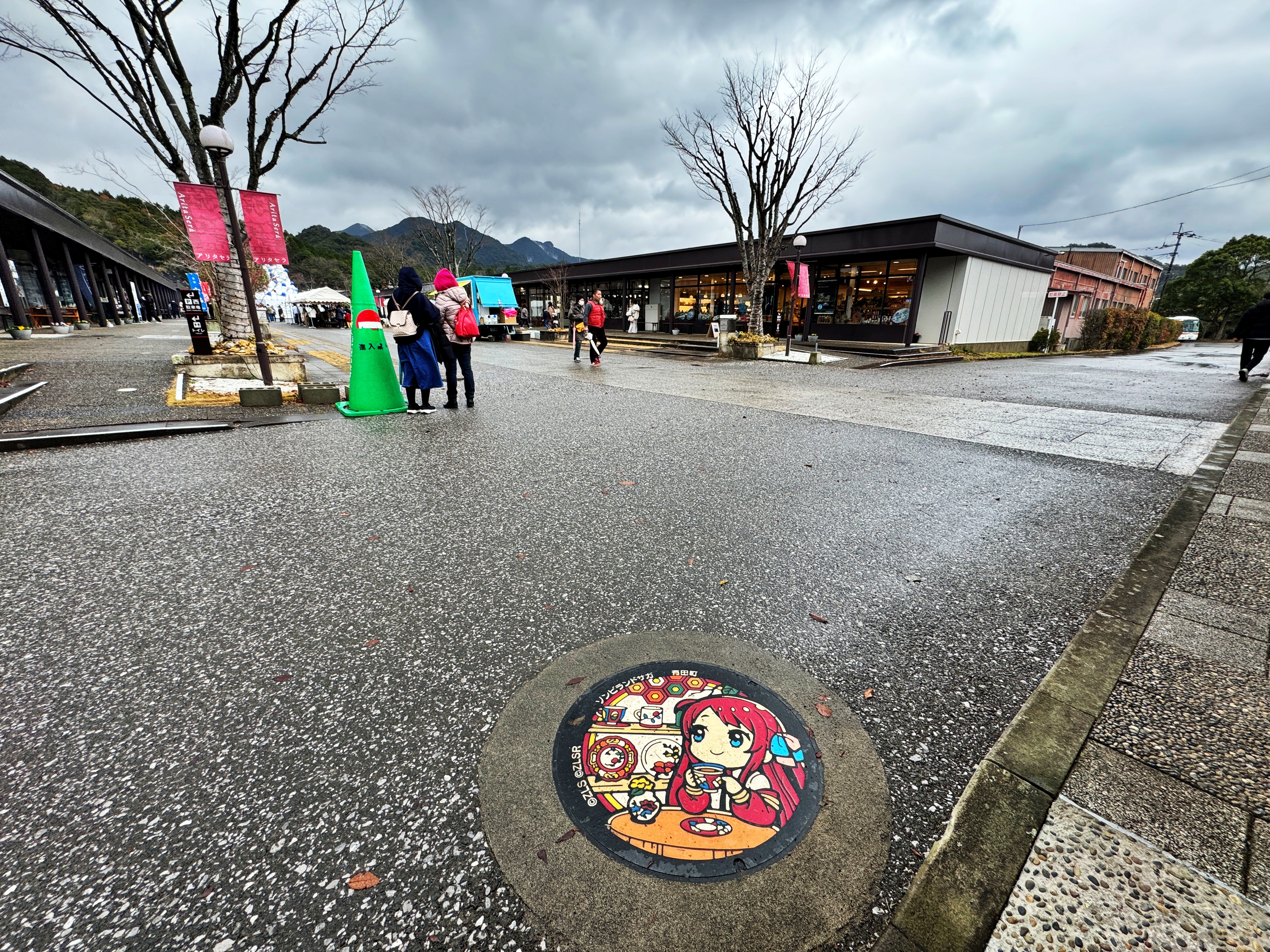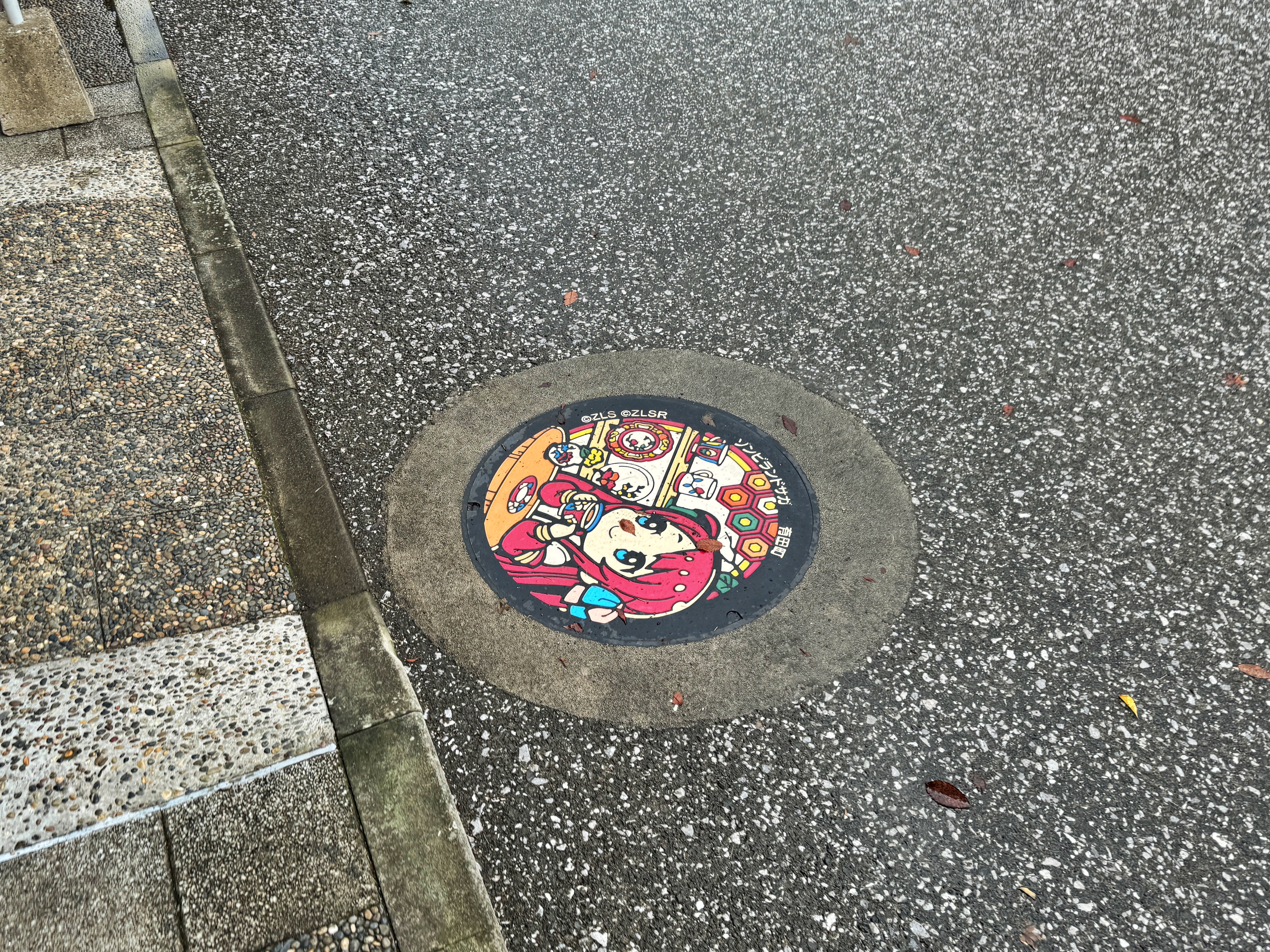 도자기 도매단지 아리타세라 남쪽의 찻잔으로 만들어진 상여를 모셔둔 건물 좌측편에 소재해 있습니다. 별다른 용도가 적혀있지 않습니다. 가짜 맨홀이네요. 배경은 아리타 세라의 화려한 도자기들. 여유롭게 차를 마시며 생각에 잠겨있는 프랑슈슈 1호 미나모토 사쿠라의 모습도 볼 수 있습니다. 크리스마스 행사장과 판매점 근처까지 둘러본 바 일반 맨홀들이 꽤 많이 있었습니다만, 상여를 모셔둔 자리 옆에 설치해뒀네요.