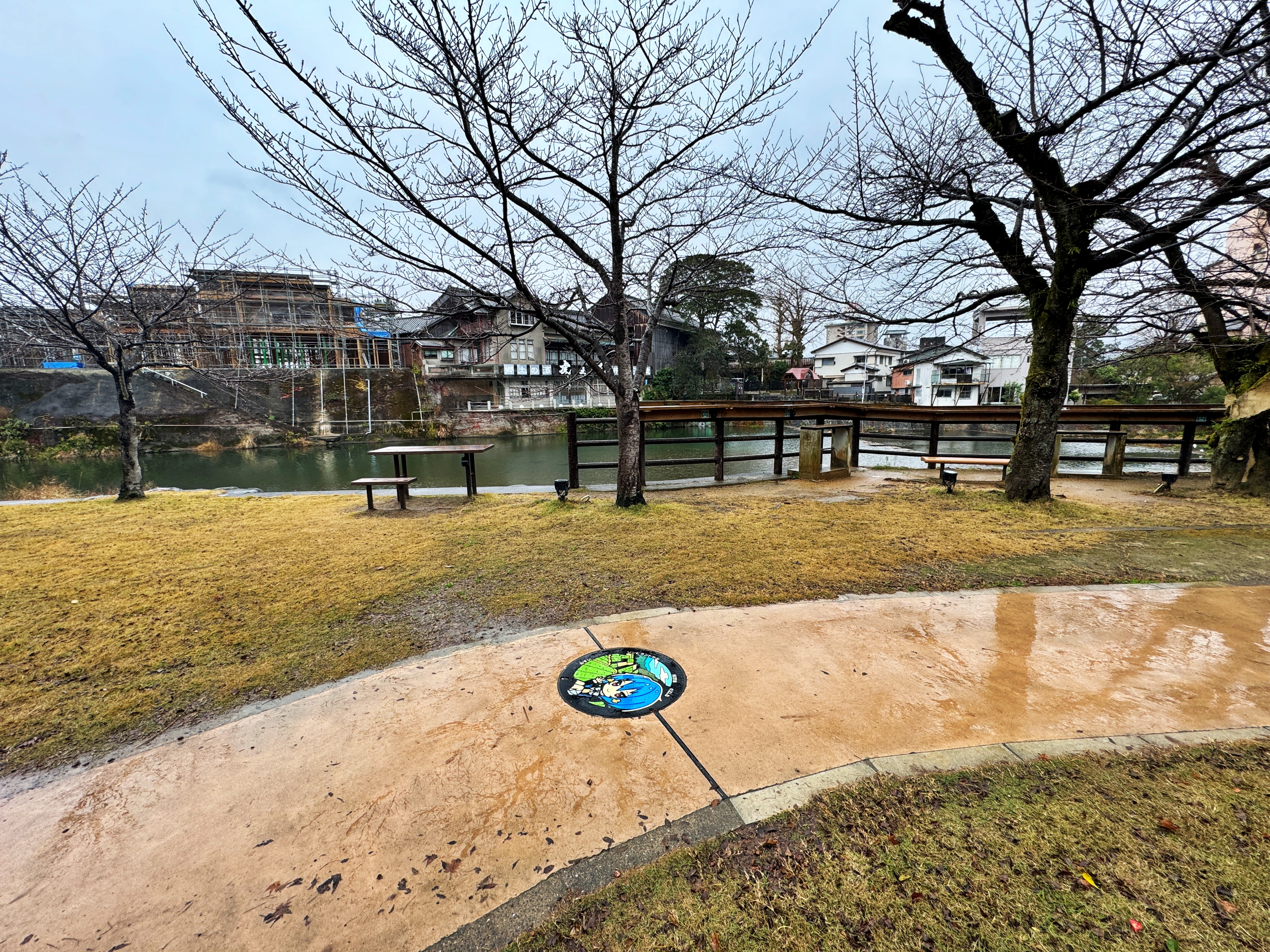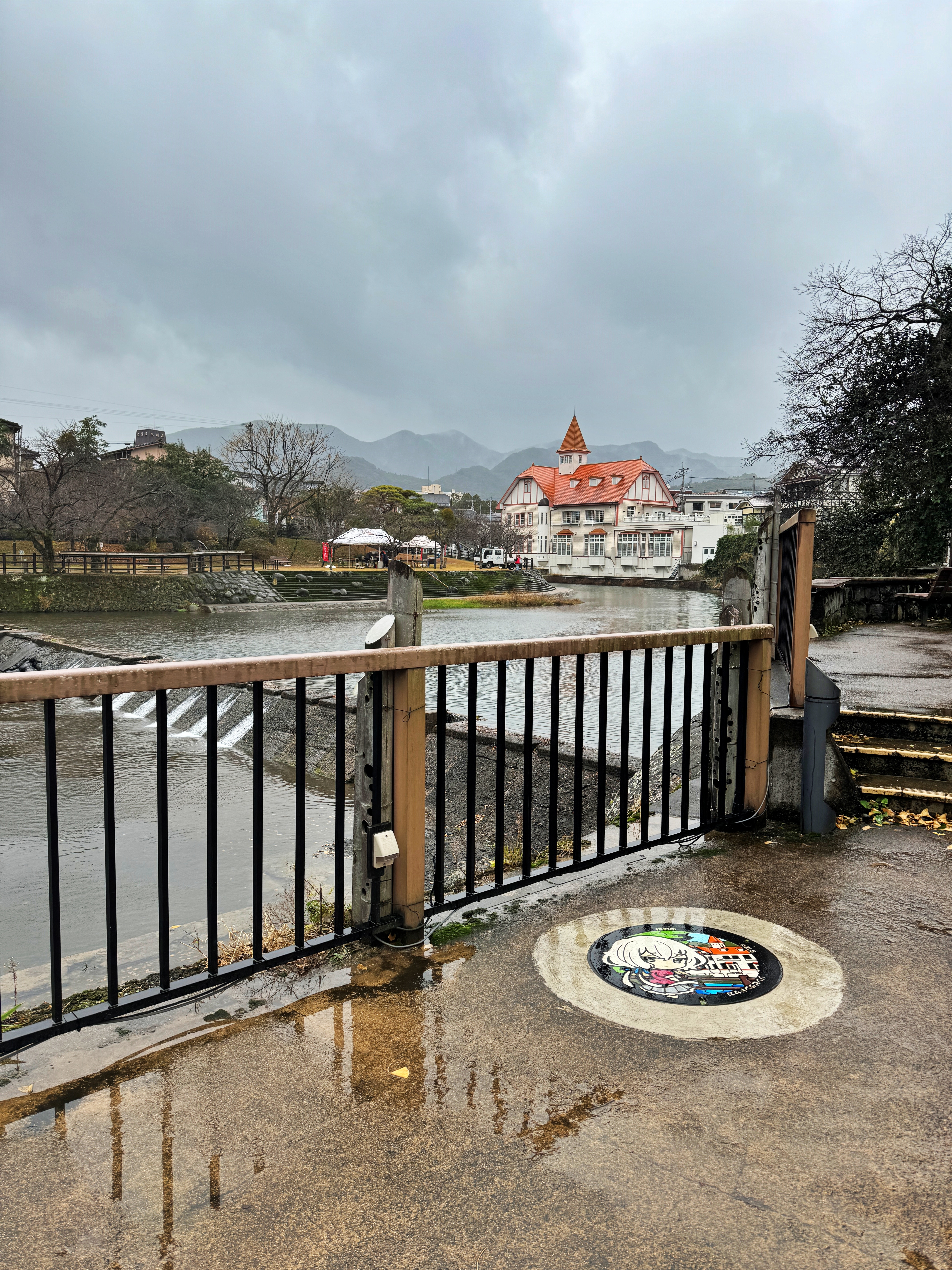 우레시노강을 끼고 붙어있는 건물들만 바라보고 있어도 그냥 힐링 그 자체입니다. 토요일인지라 무슨 행사가 있는지 공무원 아저씨들이 오셔서 텐트를 설치하고 계시네요. 상당히 복잡합니다. 그렇게 이 공원의 보행자 통로를 쭉 따라가다 보면 그림이 그려진 맨홀이 있습니다.