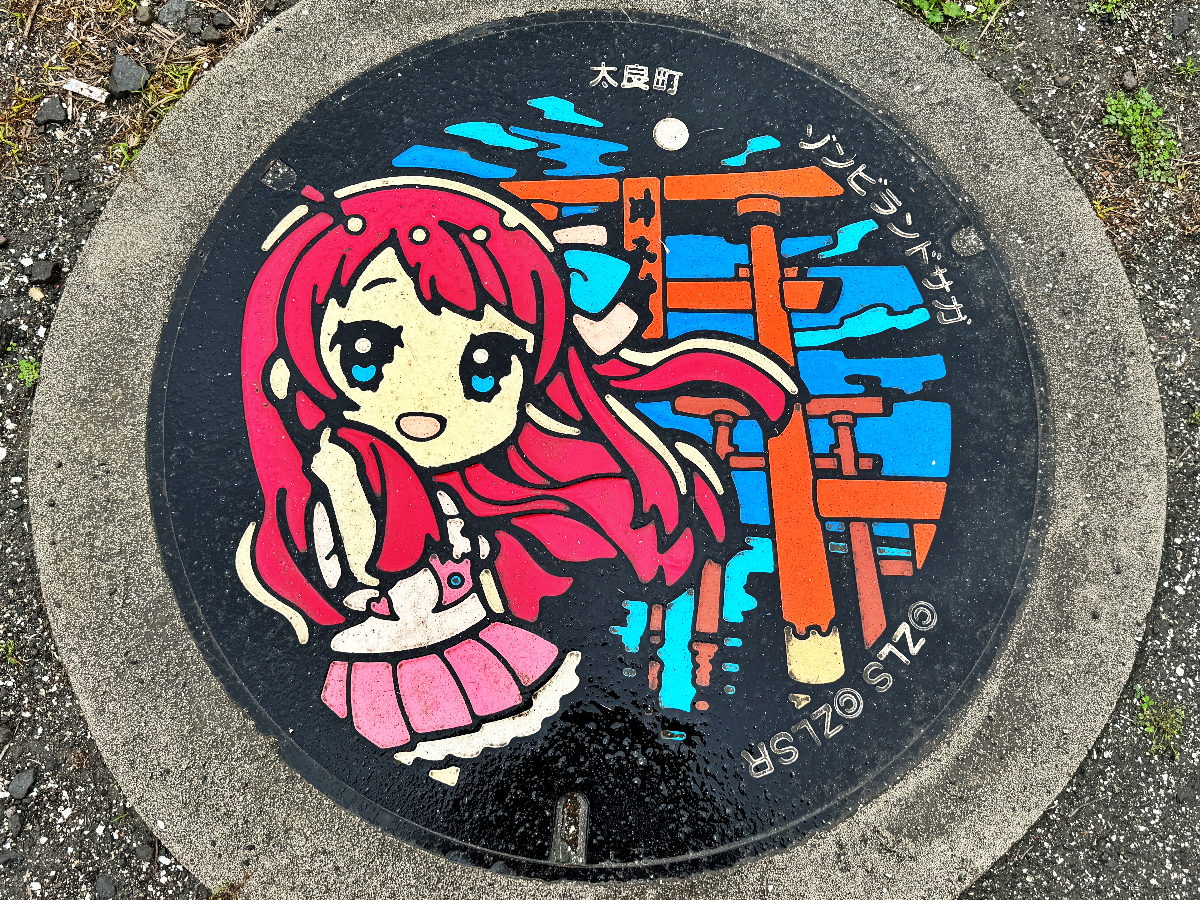 주택가 골목에서도 사람 하나 지나다닐만한 작은 골목으로 들어가야 나오는 광장에 소재한 맨홀입니다. 담당 캐릭터는 프란슈슈 4호 콘노 준코. 배경은 온천단지의 상징과도 같은 시볼트노유(シーボルトの湯)입니다. 시볼트노유가 잘 보이는 이 광장 울타리에 기대어 넌지시 바라보고 있는 모습이네요. 뒷산 그리고 강 건너편 공원의 녹지까지도 작은 맨홀 안에 모두 구현되어 있습니다. 아 맨홀은 딱히 사용목적이 기재되어있지 않은 모습으로 보아 이 프로젝트를 위해 설치된 가짜입니다.