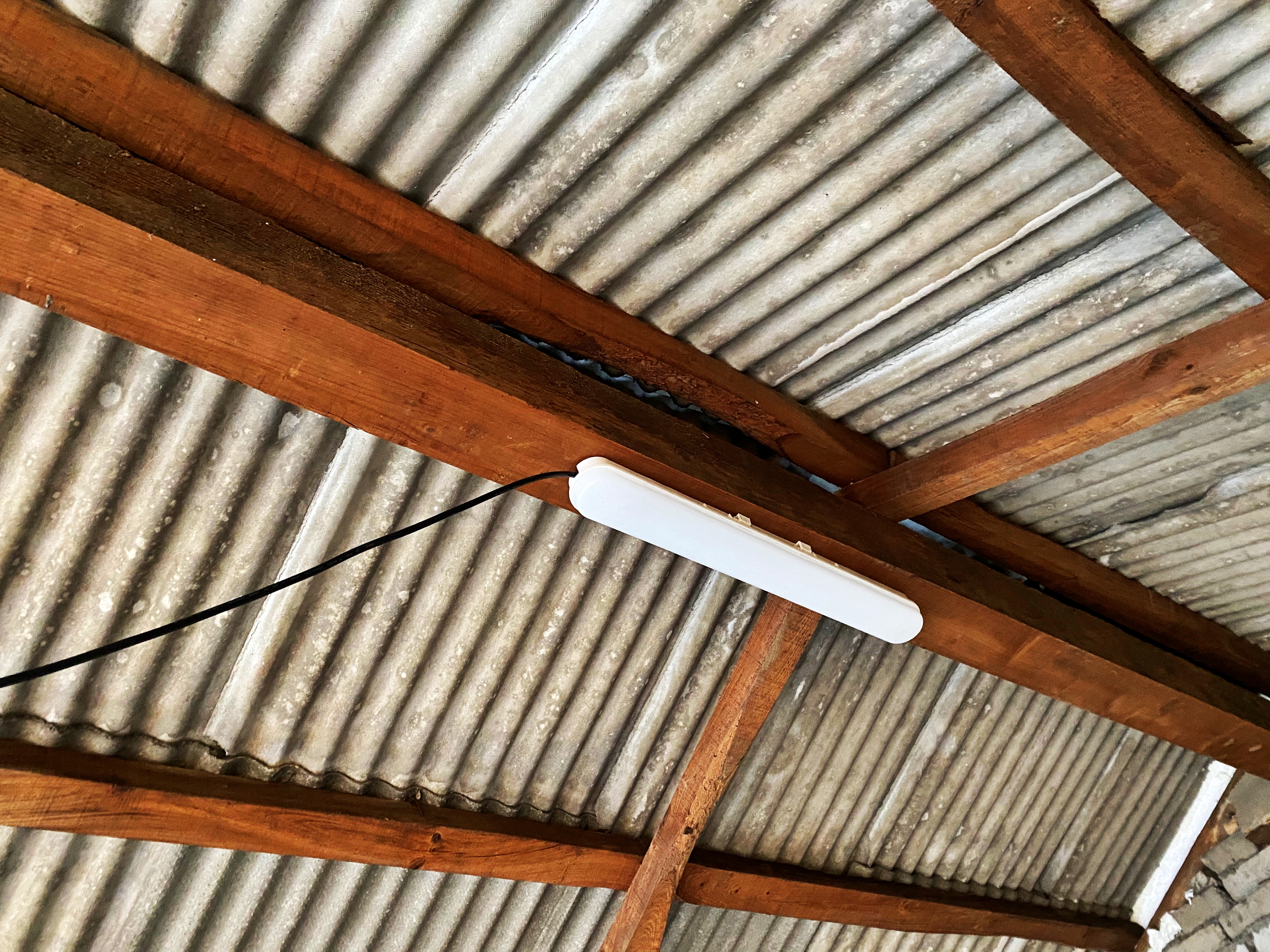 이렇게 전등에서 나온 배선은 쭉 지붕을 구성하는 오비끼를 타고 우측 벽으로 내려옵니다.