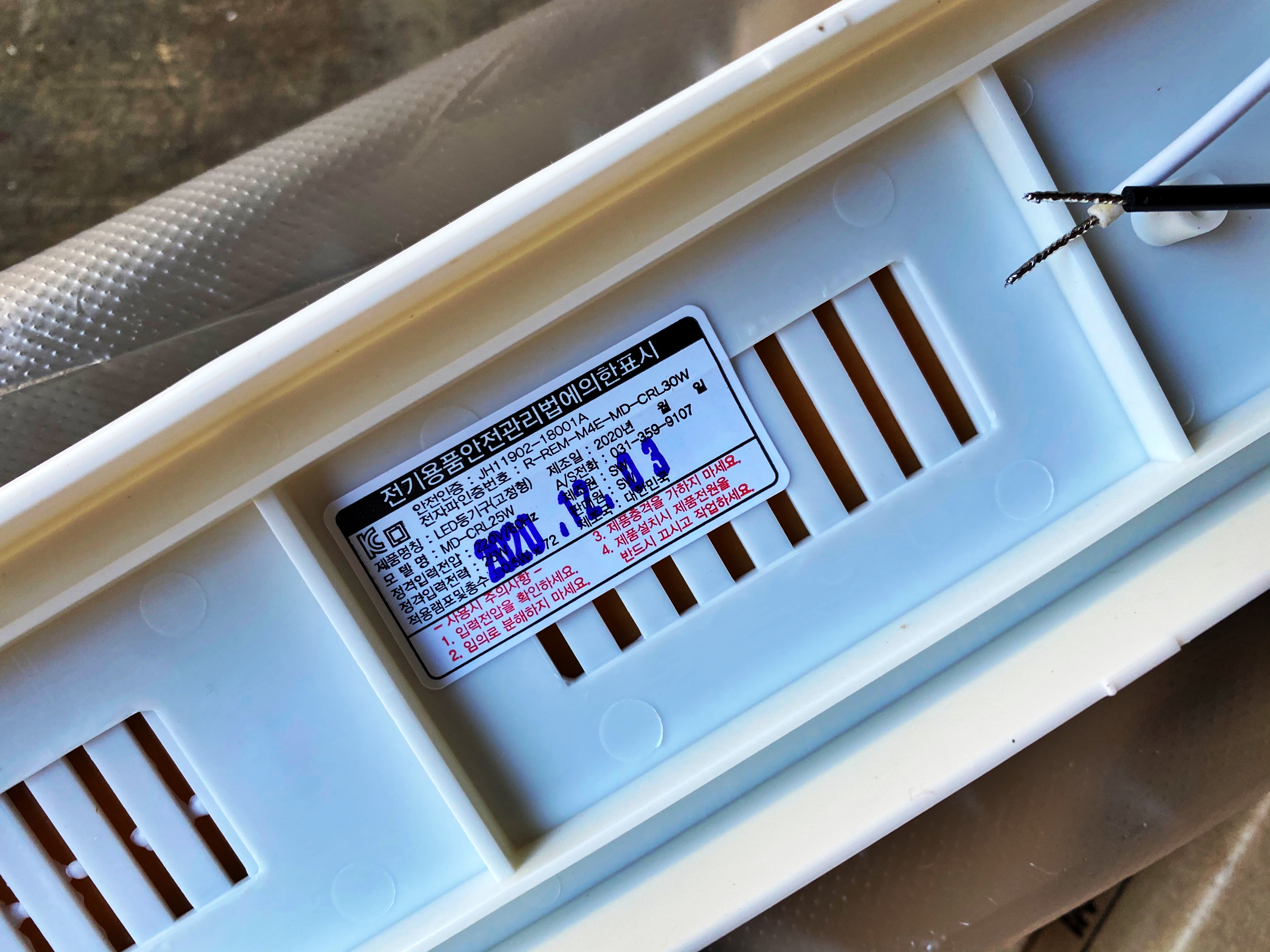 제조된지 보름만에 장착되는 LED 등기구네요. 장착에 앞서 배선을 어떻게 연결 할 것인지 미리 컨넥터와 배선의 피복을 벗겨 예행연습부터 하고 가기로 합니다. 전기를 따오는 일은 조금 어두워져도 상관 없으나 어두컴컴한 차고 안에서의 작업부터 빨리 마쳐야 하니 일단 형광등부터 달아주고 전기를 따오기로 합니다.