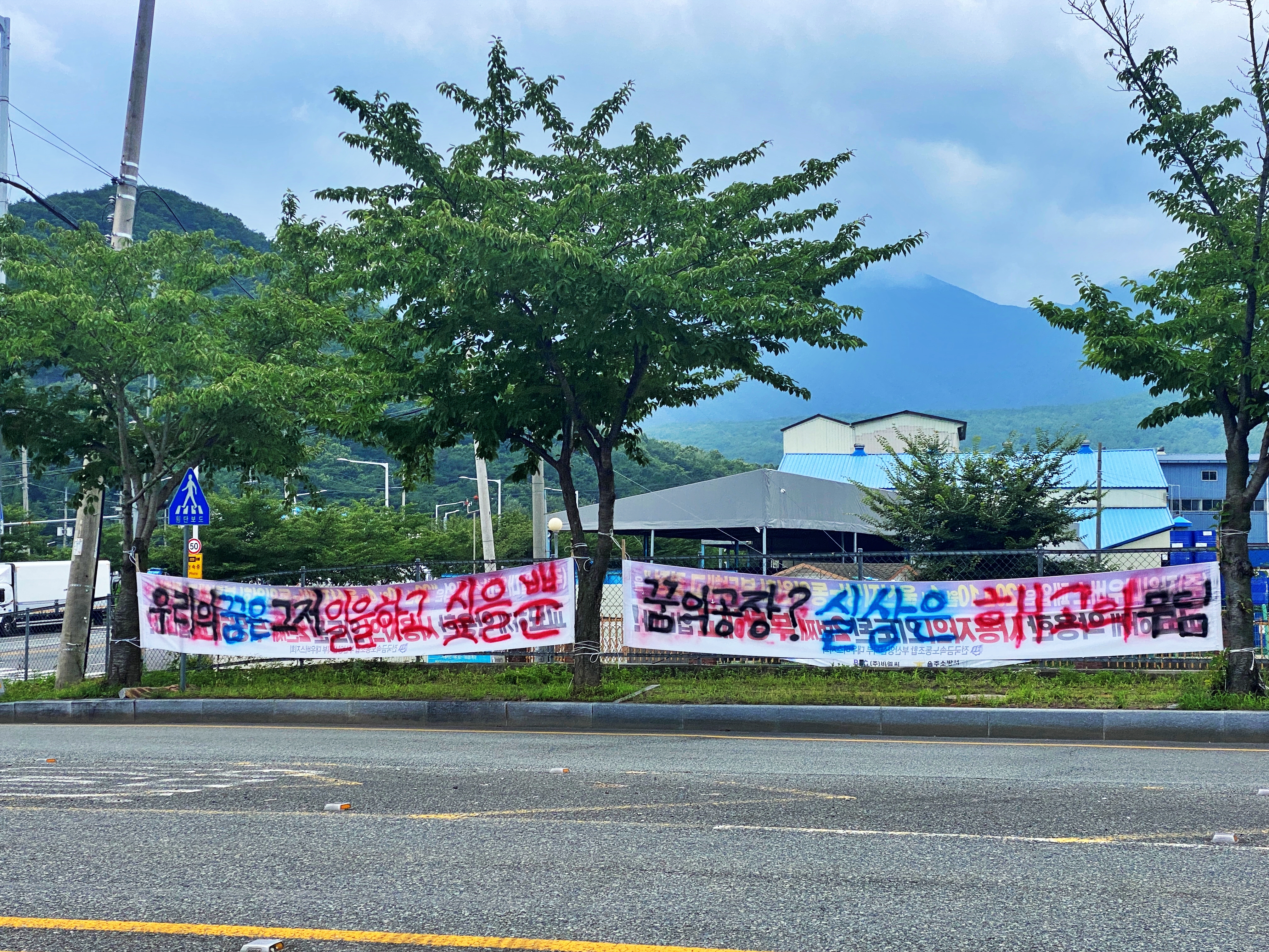 상황을 알리는 현수막 맞은편으로 공장 정문이 보입니다.
