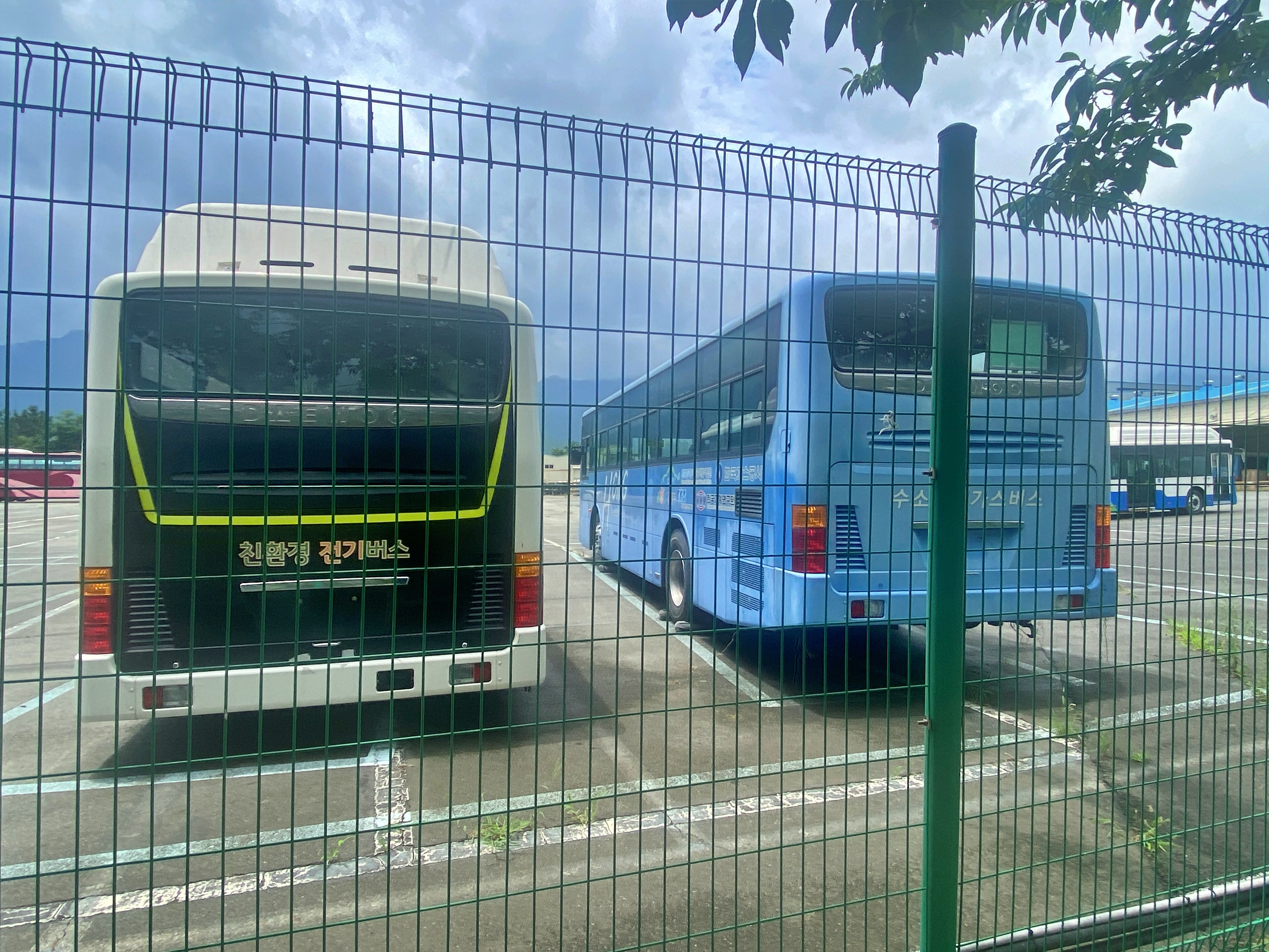 덩그러니 세워진 세대의 차량은 전기버스 BS110 EV로 보입니다. 성남시내버스에서 주문했다가 취소한 차량들로, 배터리 용량도 상대적으로 적고 충전 시간도 오래 걸려서 출고된 차량들도 여러 노선을 전전하고 있다고 하네요. 어느 순간부터 보조금 지급 대상에서도 빠지기 시작하여 현재는 완전히 단종되었다고 합니다. 지방 중소도시에서도 전기버스와 수소버스를 쉽사리 볼 수 있을 정도로 대세로 굳어지는 상황에서 정말 아쉬운 대목입니다.