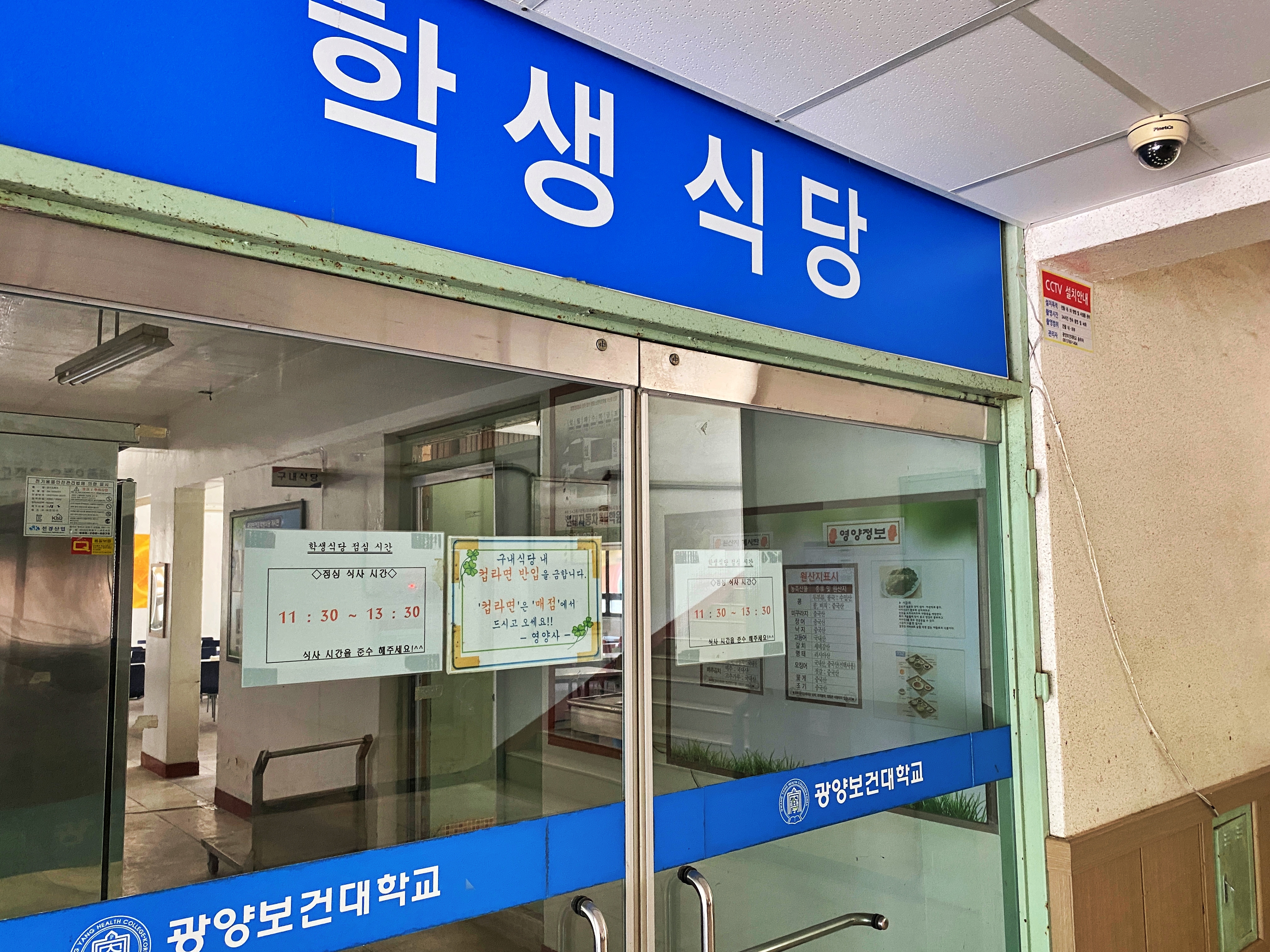 문은 닫혀있네요. 재학생이 그리 많지 않지만 학기중에 온다면 학식도 먹을 수 있을지 모르겠습니다. 식당에 컵라면을 반입하는 학생들이 많아 안내문도 붙어 있네요.