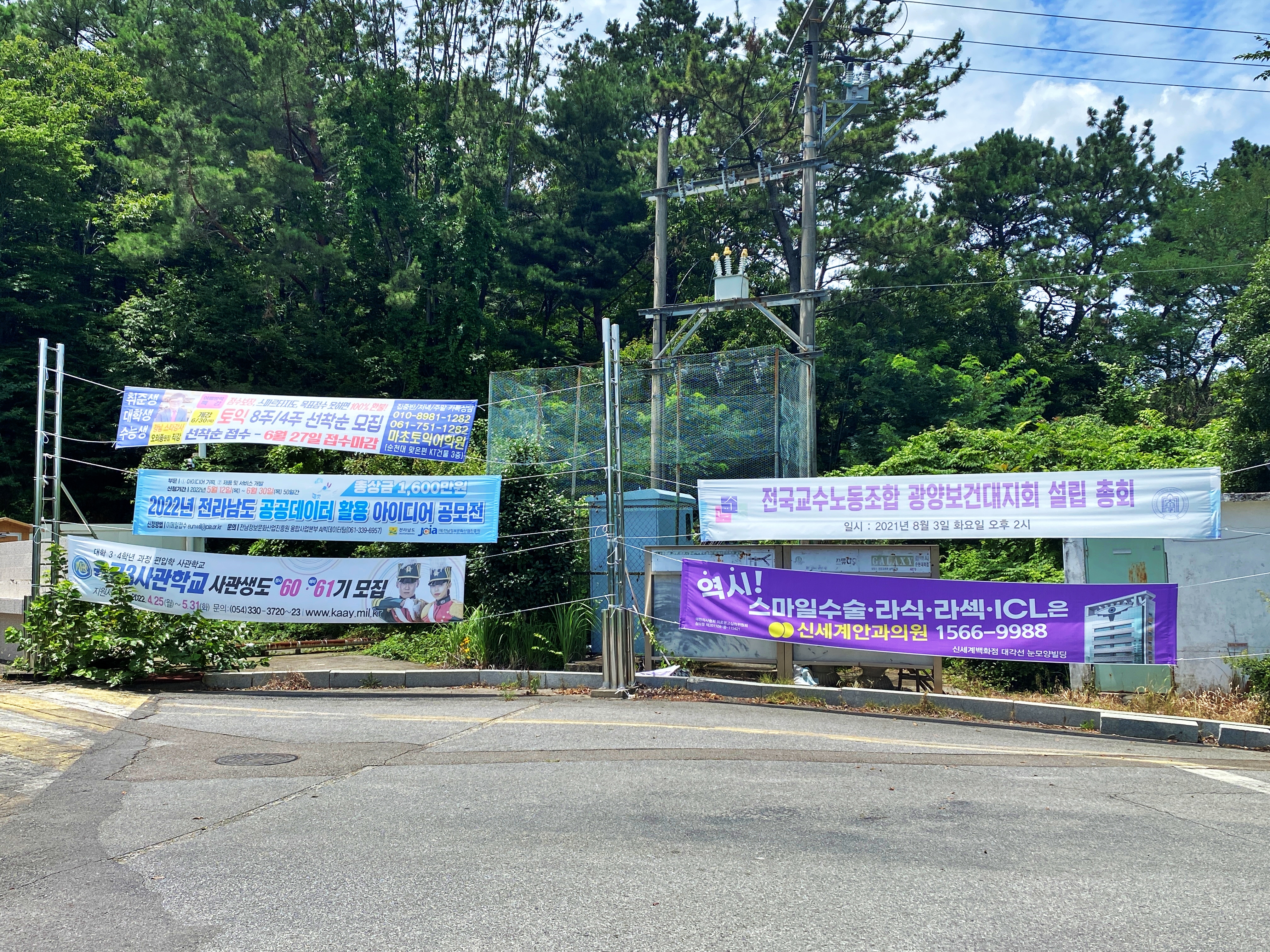 잘 보세요. 2022년 7월 중순에 방문하였습니다만, 언제 걸었는지 모를 안과의 홍보 현수막을 제외하면 이미 한참 전 그 기간이 지난 현수막들입니다. 포스팅을 작성하는 이 시점 기준으로 1년이 넘어간 교수노동조합 설립 총회 현수막부터 토익학원 현수막이나 공모전 현수막 3사관학교 현수막까지 모두 오래전 그 기한이 지나버렸습니다.