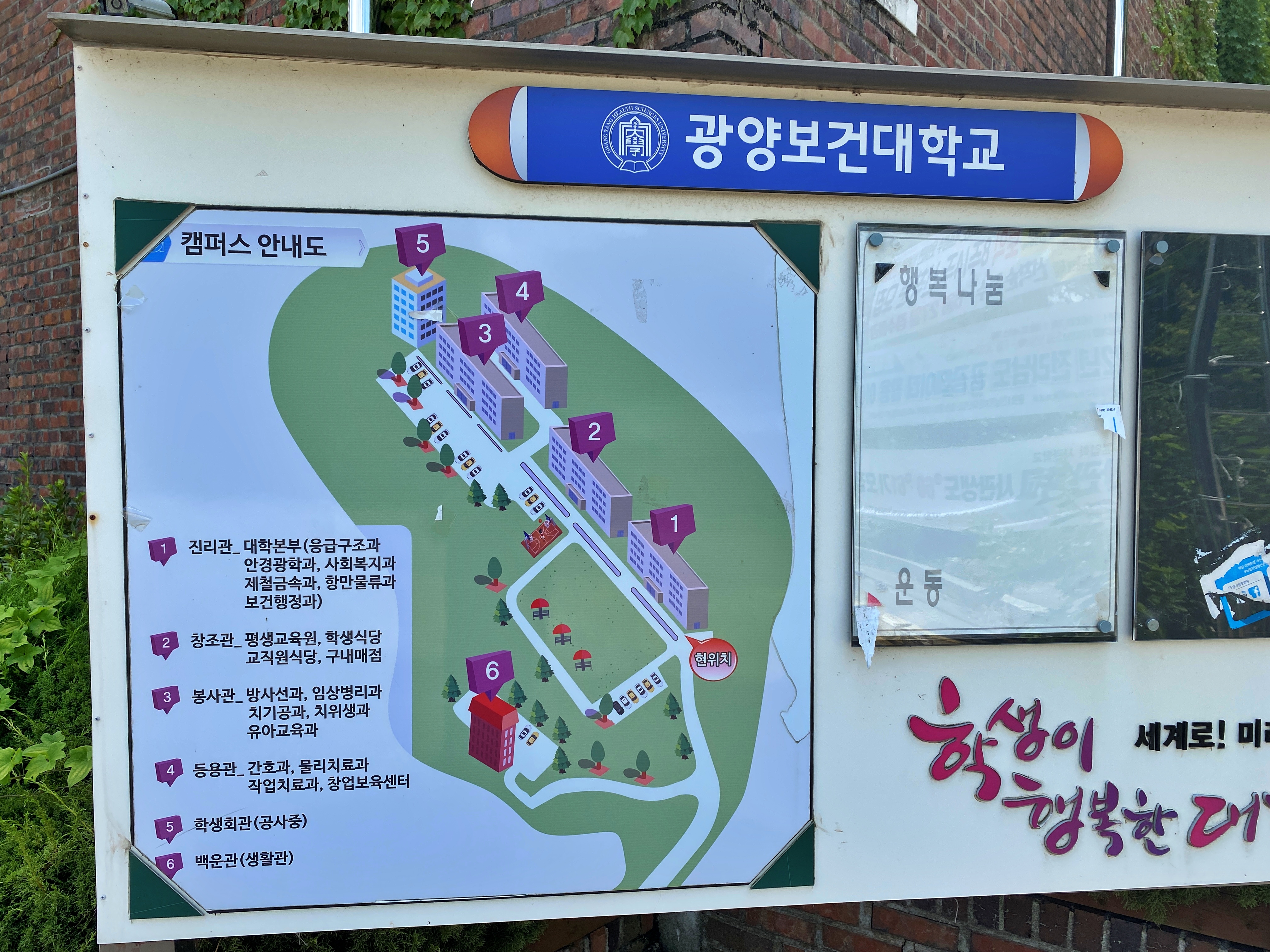 '세계로! 미래로!'는 바로 전 한려대학교에서도 봤고 이전의 이 계열 다른 학교에서도 많이 봤던 문구죠. 사실상 '학생이 행복한 대학'이 이 학교만의 슬로건이 아닐까 싶습니다. 폐교탐방 애독자 중 이 학교를 나오셨던 분이 계신데, 대학 생활이 행복하셨는지 듣고 싶습니다.
