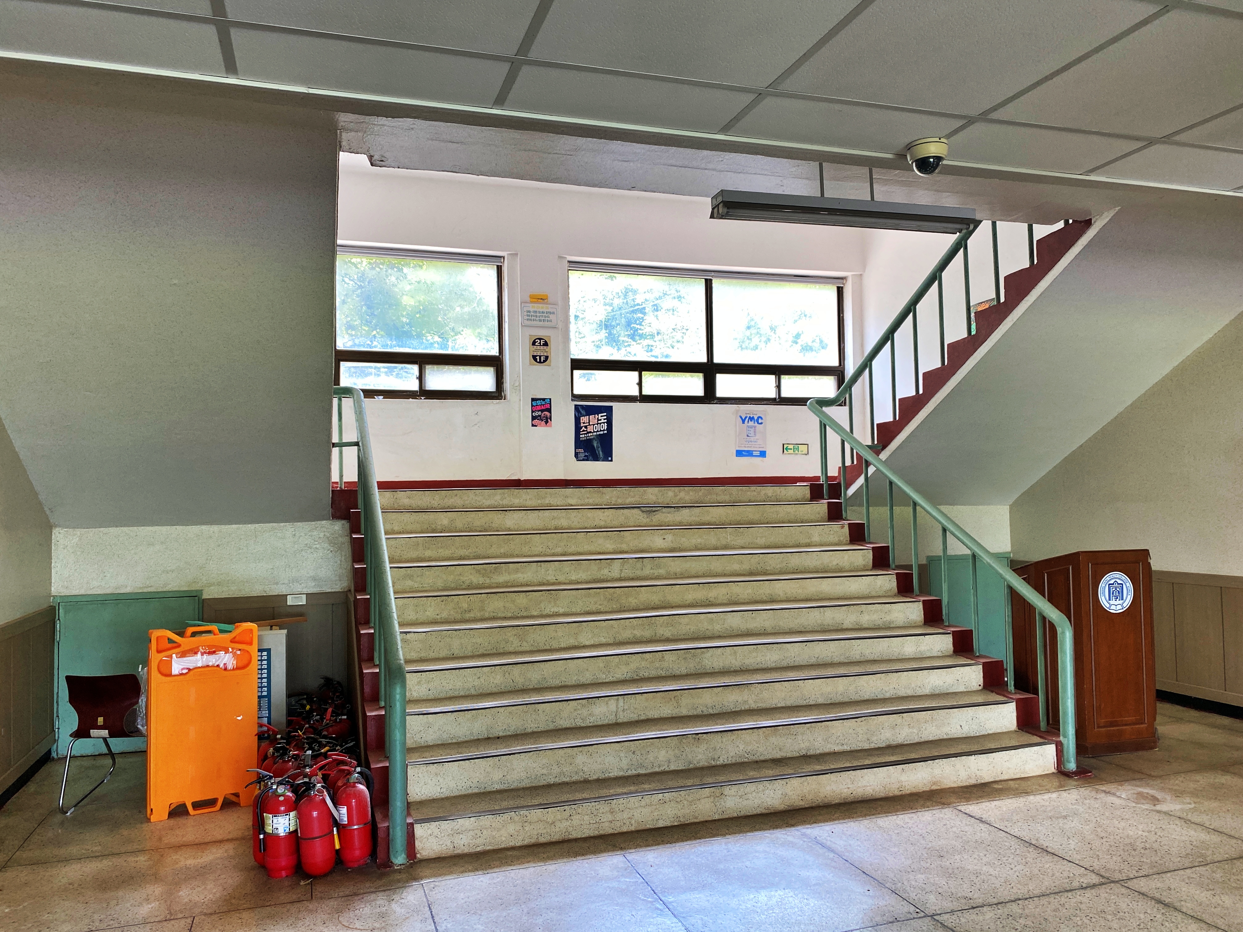 나름 진리관 현관 옆은 몰딩도 붙이고 세련된 느낌의 리모델링이 진행되었는데, 계단은 90년대 느낌 그대로입니다. 계단의 난간봉 색상 역시 그렇고요. 바닥 역시 고무타일이라도 깔아 두면 모르겠는데, 너무 오래된 느낌이 강합니다.