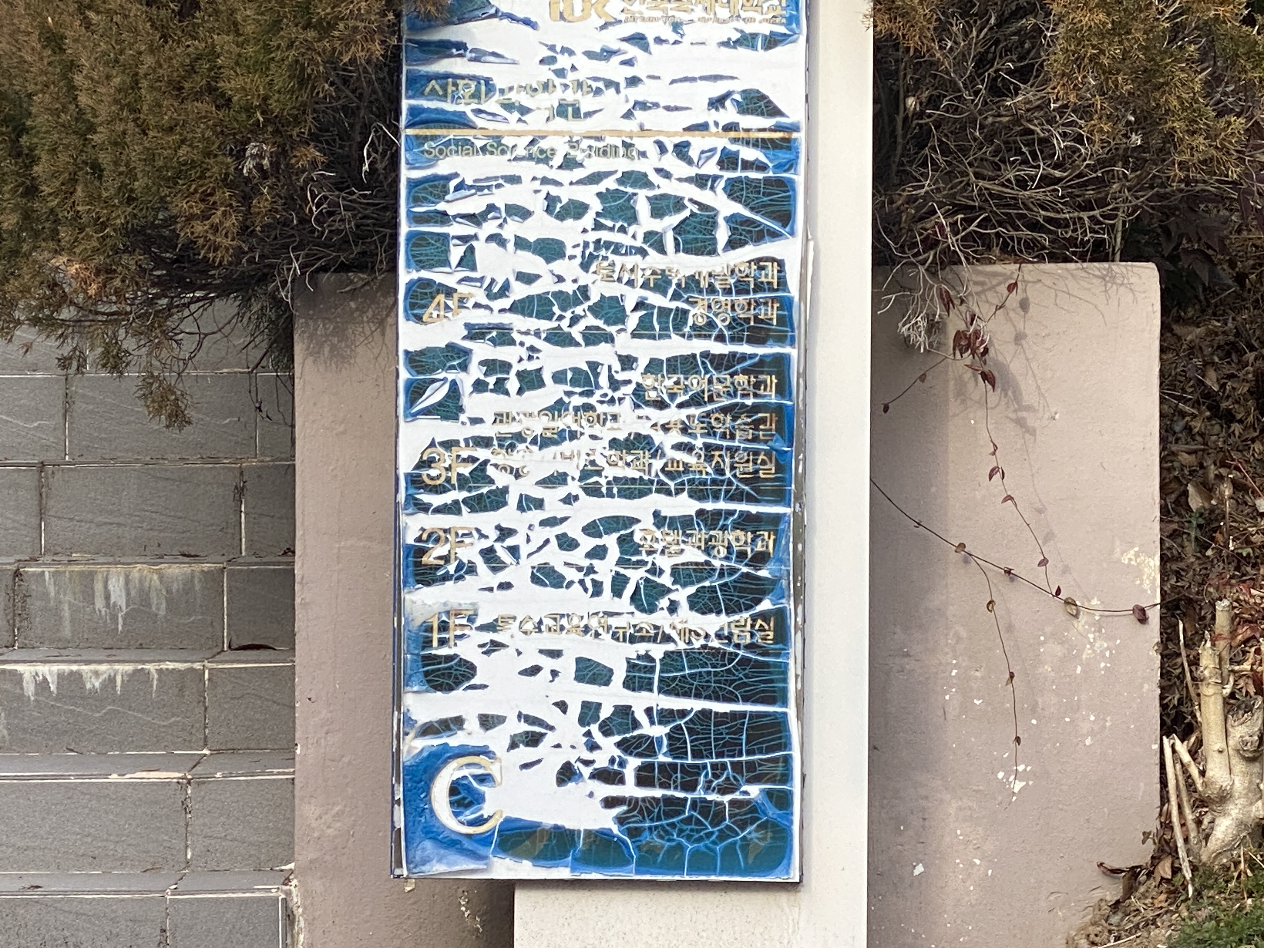 건물 안내 표지판의 스티커는 오래되어 이미 말려들어간 지 오래입니다. 그래도 관리가 잘 되던 입구 근처 건물들에 비하면 아쉽게 느껴집니다.