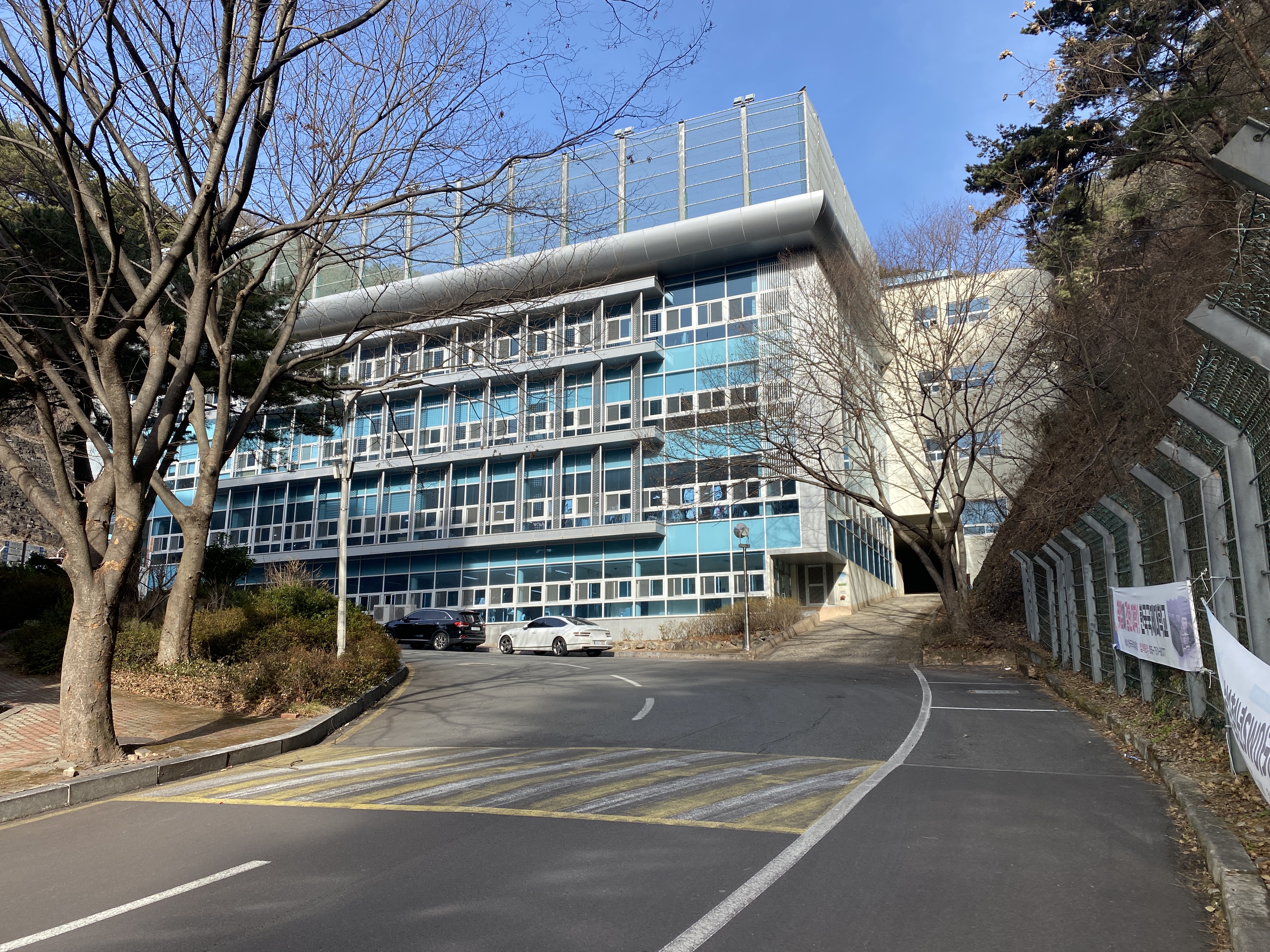 대학본부를 기점으로 내려가는 길이 생기는 구간에서 바라본 교육과학관입니다.