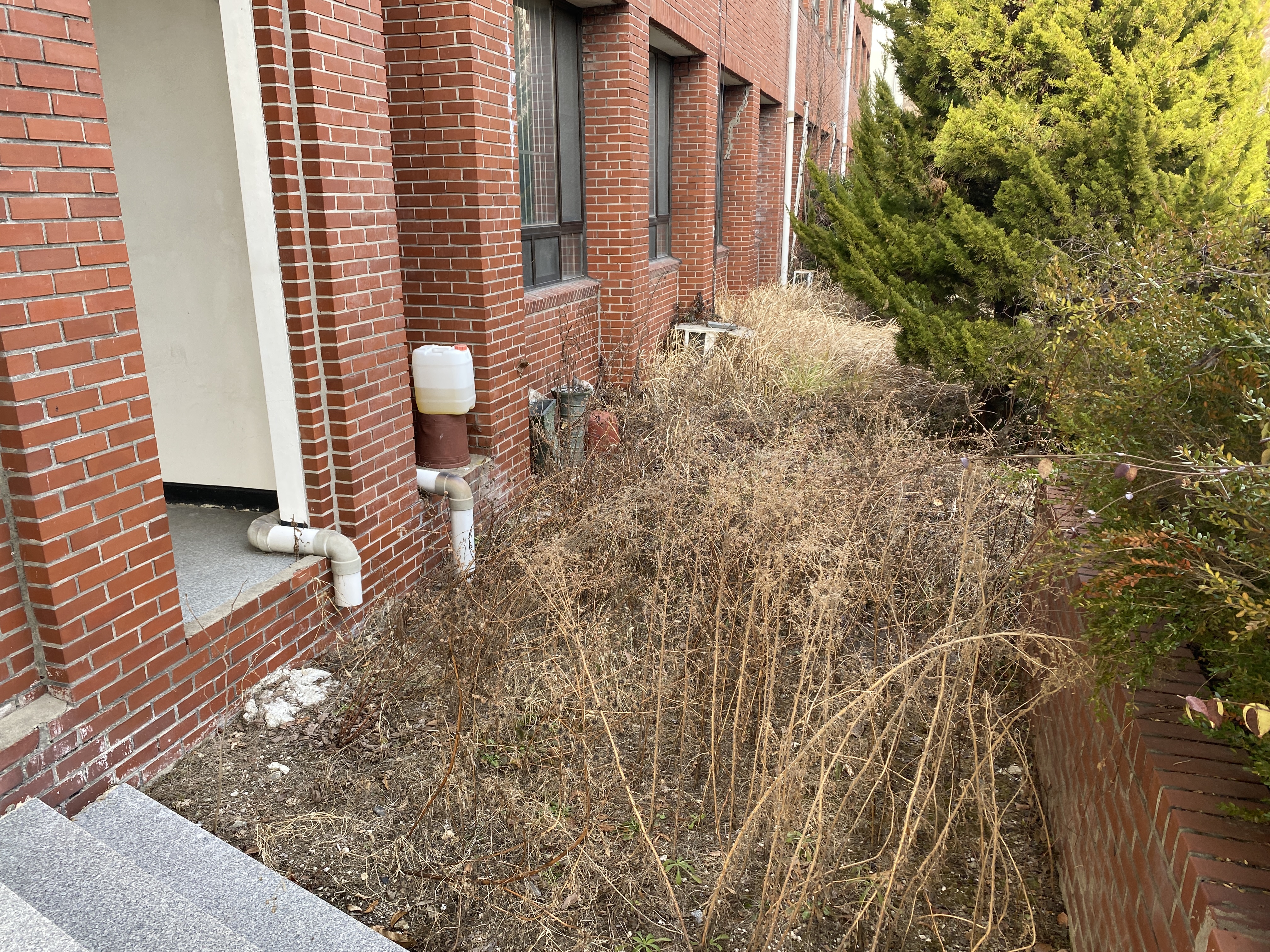 도서관 건물 옆 화단 역시 여러 잡초들의 흔적이 보입니다. 다른 건물도 아니고 학문을 연구하는 학생들에게는 필수인 도서관이 이렇게 멀리 그리고 접근하기 어려운 곳에 있다는 건 이해하기 어려운 대목입니다.