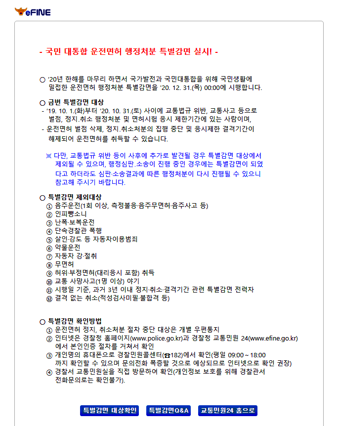 이로 인해 전국의 111만명의 운전자가 수혜를 입었다고 하네요. 19년 10월부터 20년 10월까지 교통법규 위반으로 벌점이 부과된 사람에게는 벌점을 지워주고 운전면허 정지 혹은 취소처분절차가 진행중이거나 결격기간에 있는 사람들에게는 행정처분을 중지한다고 합니다.