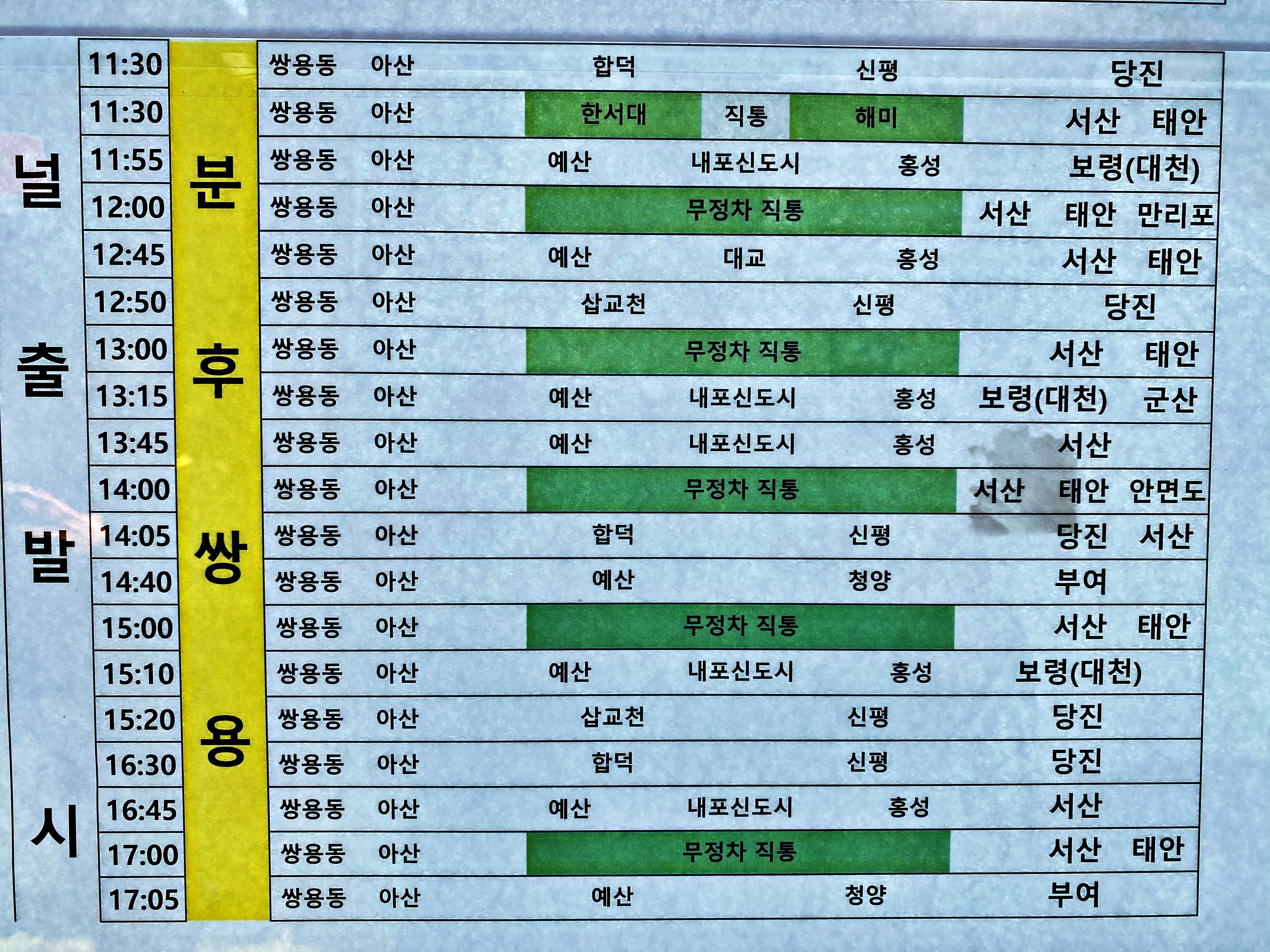 천안터미널을 출발한 서해안 방면 시외버스가 7~10분만에 쌍용동 정류소를 경유합니다. 말이 10분이지 정체가 심한 출퇴근시간대에는 15분 이상도 걸리곤 합니다. 아래는 시간표입니다. 이미지를 클릭하시면 확대하여 볼 수 있습니다.
