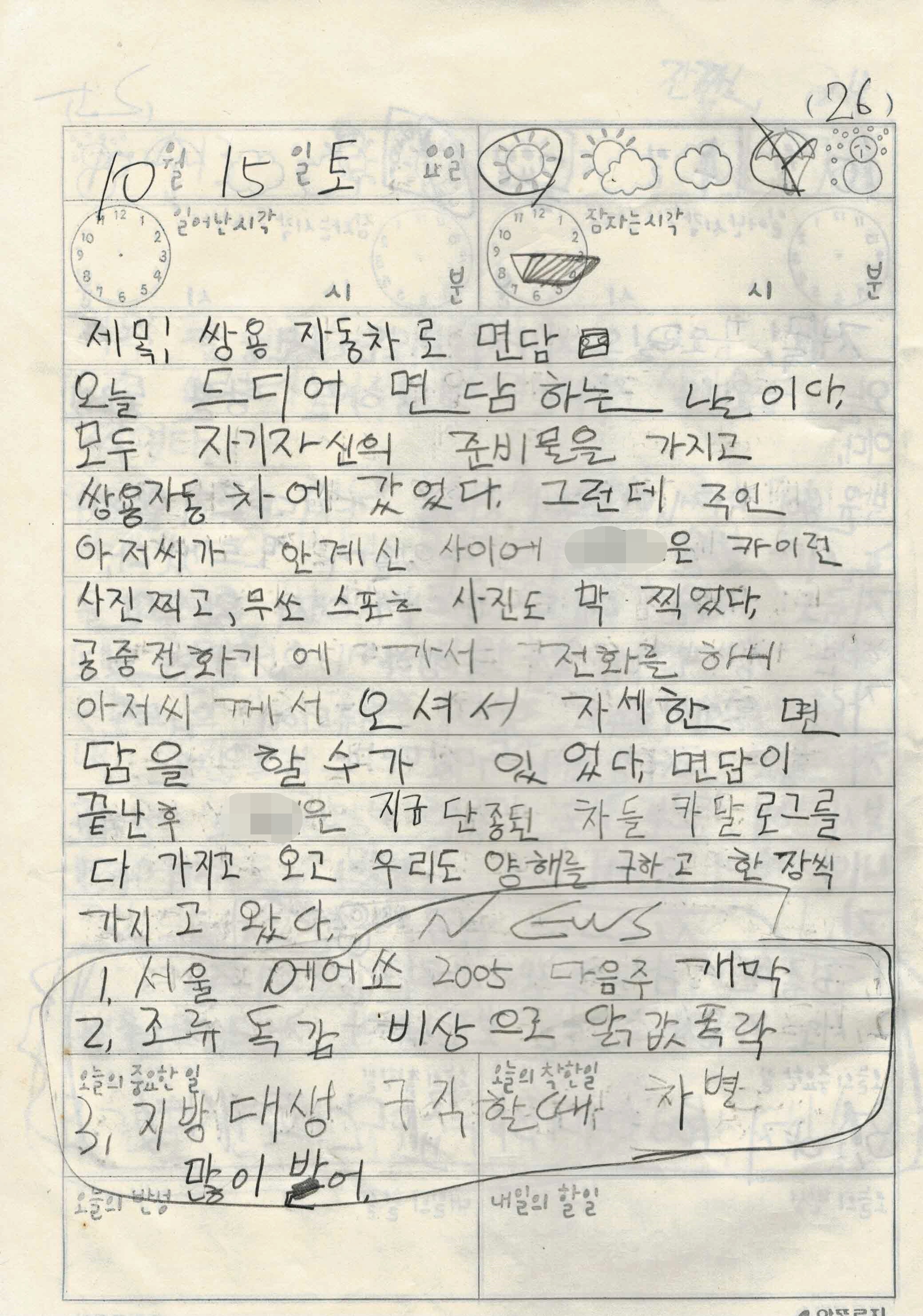 당시 담임선생님은 일기장에 뉴스를 보고 뉴스 세가지를 적어오라고 하셨습니다. 그런고로 2005년 10월 15일에 보도되었던 뉴스 역시 확인 할 수 있네요. 에어쇼가 다음주 개막하고, 조류독감 비상으로 인해 닭값이 폭락하고 지방대생은 구직과정에서 많은 차별을 받는다는 내용입니다.