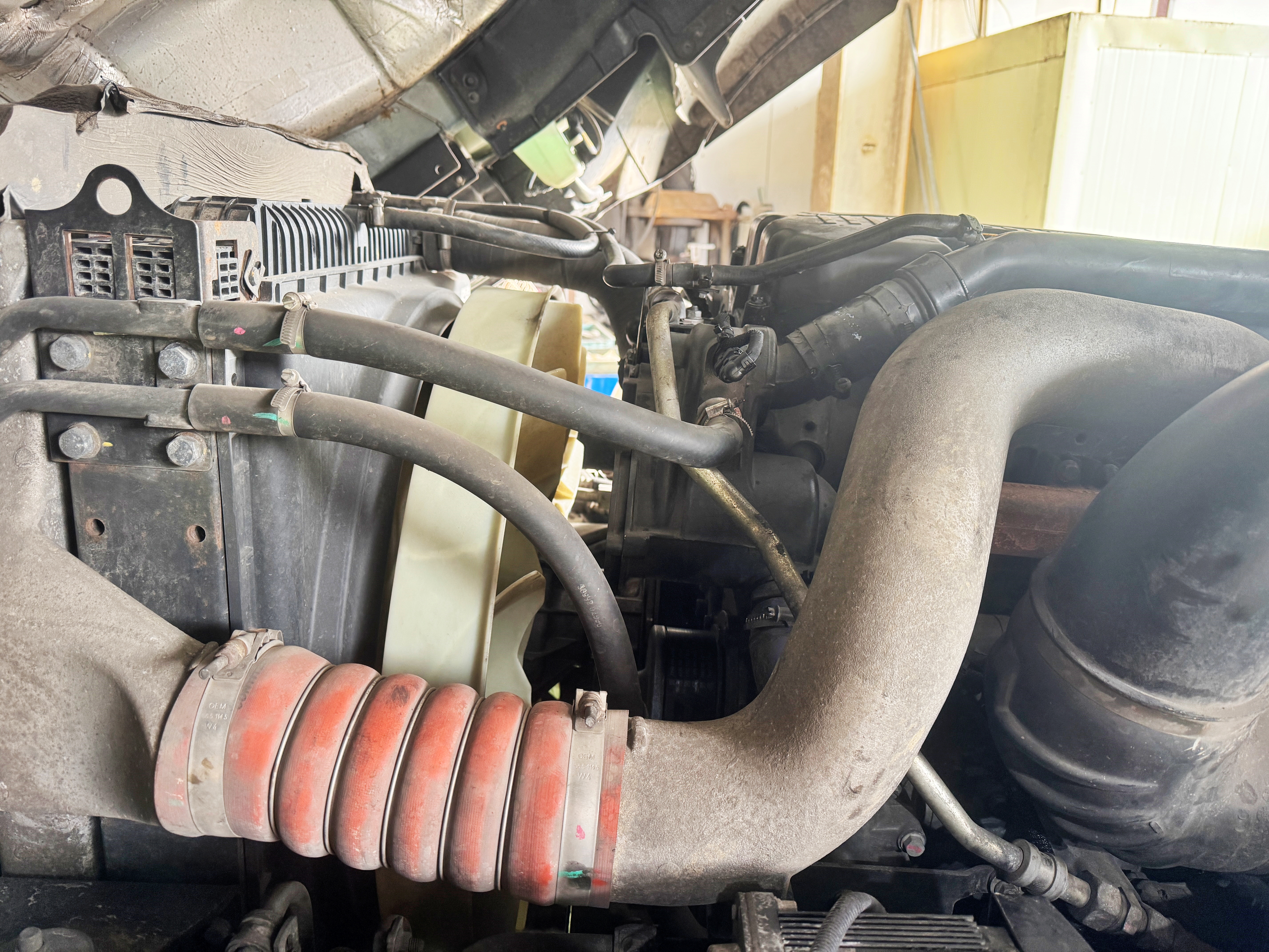 1축 앞바퀴 뒤편 프레임 안쪽의 엔진 헤드 틈새에서 물이 새는 모습을 보여주고 헤드에서 물이 샌다고 이야기하니 바로 탑을 들어 올려 엔진을 확인합니다. 그리고 다행히 위쪽 와셔에서 물이 샌다며 헤드 문제는 아니라며 냉각수를 배출해 냅니다.