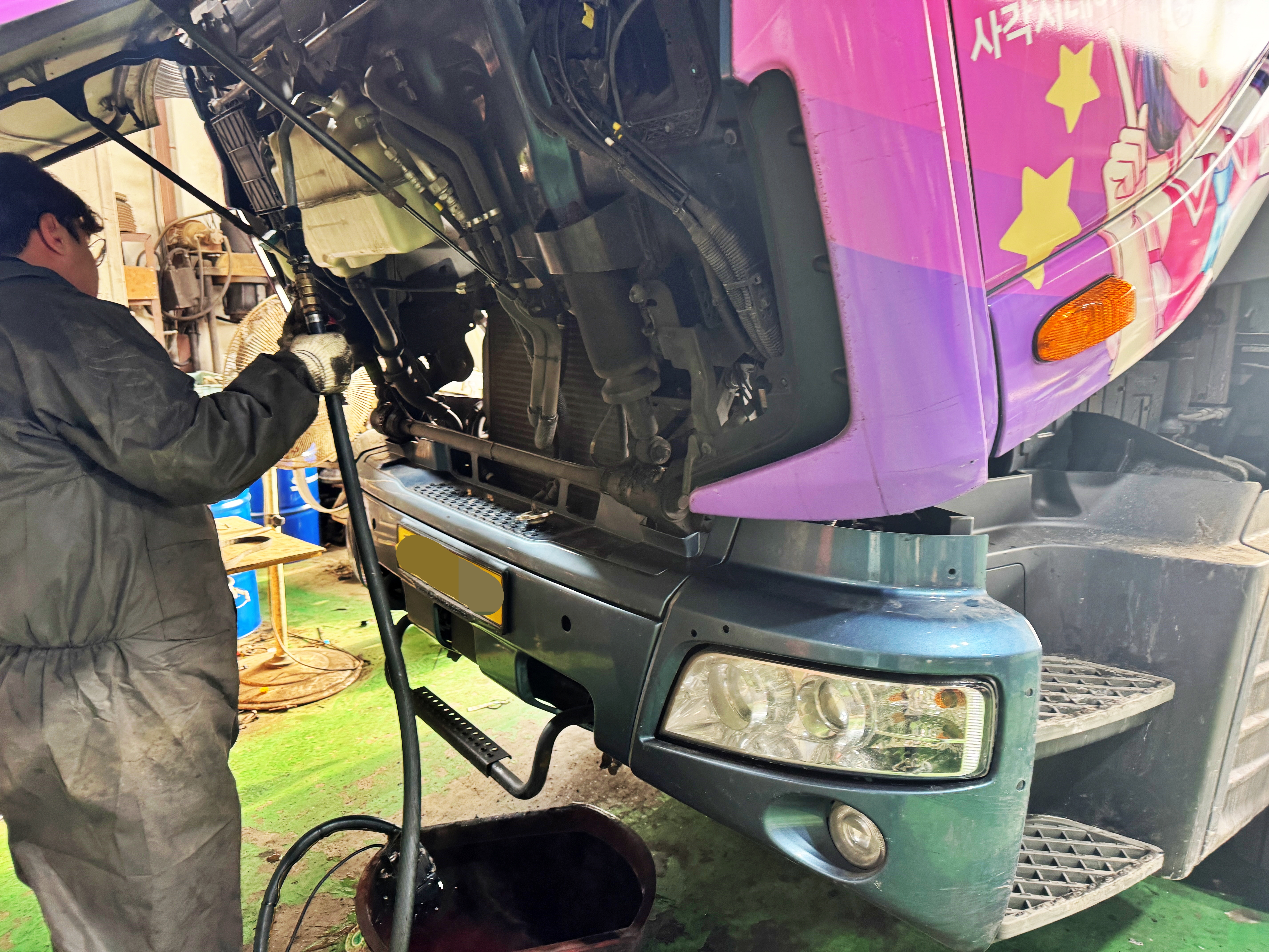 냉각수 보조통이 매우 그지같은 위치에 있는 타타대우차 특성상 펌프를 이용해 냉각수를 주입합니다.