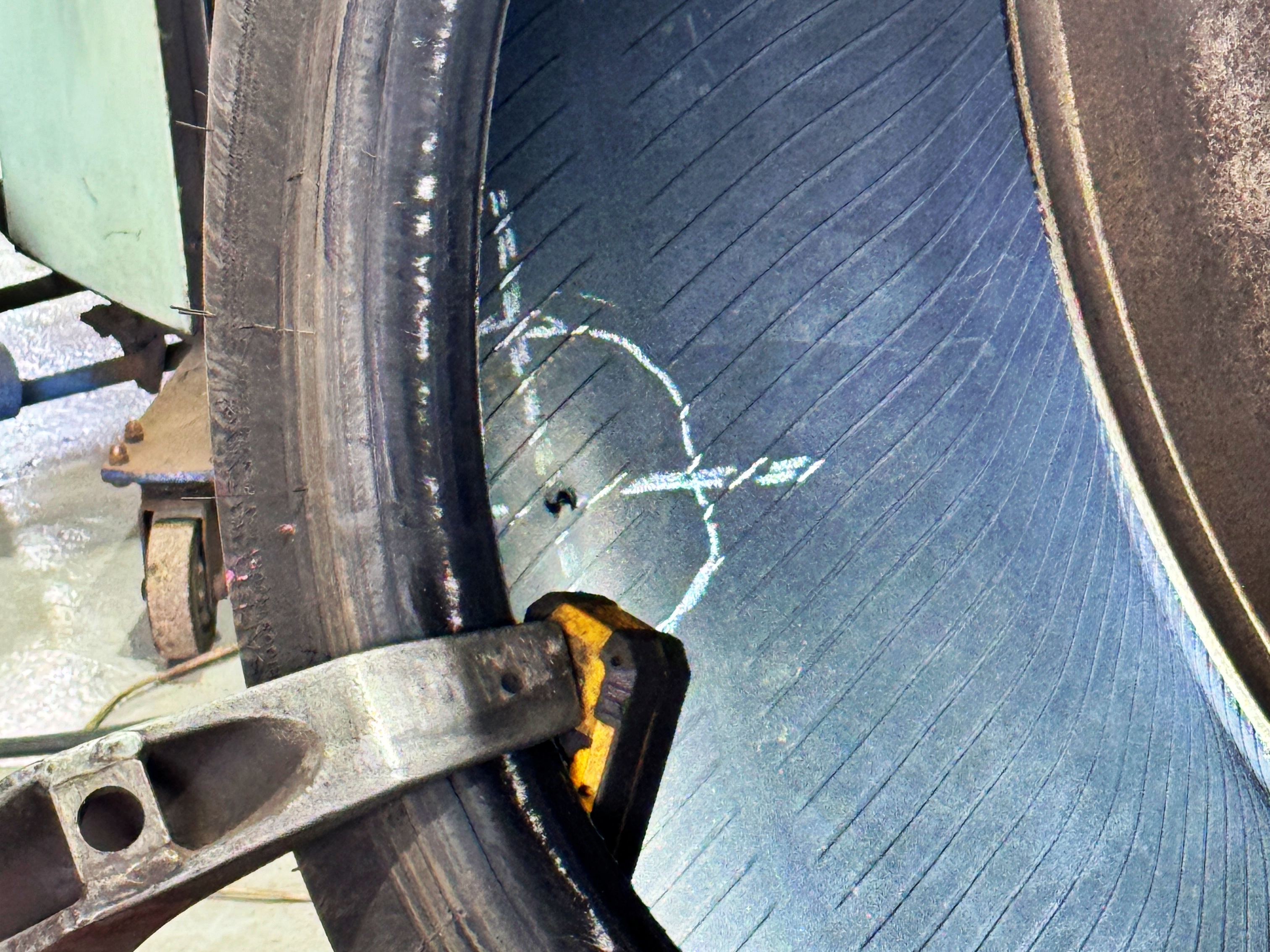 작년에도 동일하게 균열이 생기고 그 틈 사이로 에어가 새어나갔는데 올해 역시 마찬가지입니다. 여기서는 타이어 수리를 하지 않아 바로 옆 타이어가게로 이동하여 펑크수리를 진행합니다. 대충 봤을 때 엄청 큰 무언가가 박혀있었던 건 확인했는데 휠타이어를 탈착하고 보니 제 엄지손가락만한 볼트가 박혀있네요.