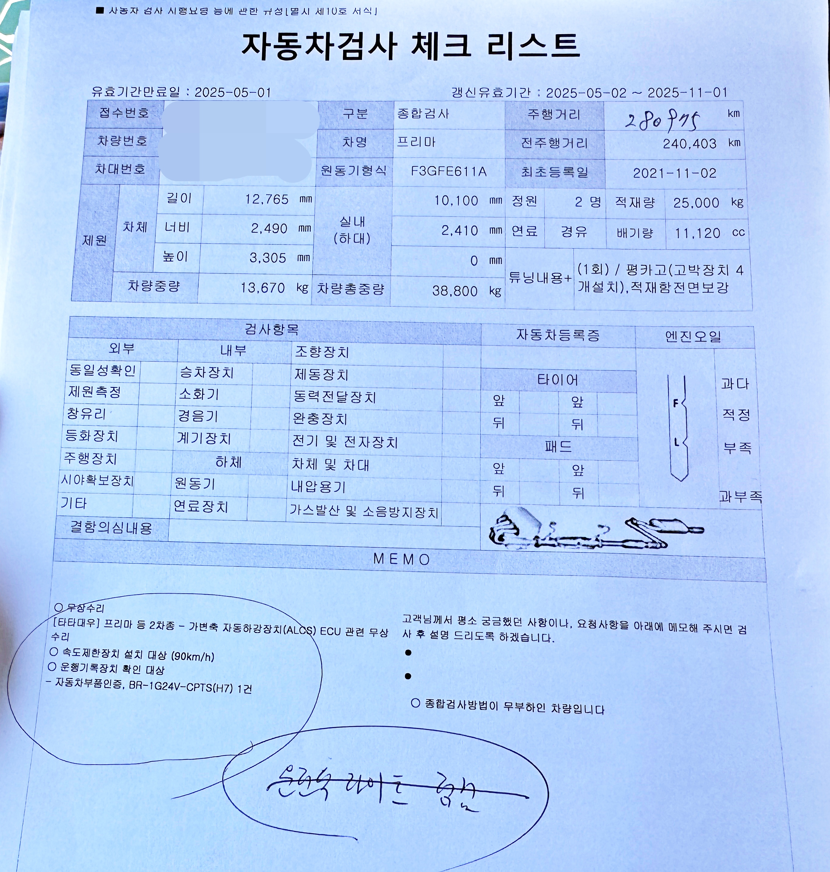241017 프리마 25톤 카고 정기검사 + 펑크수리