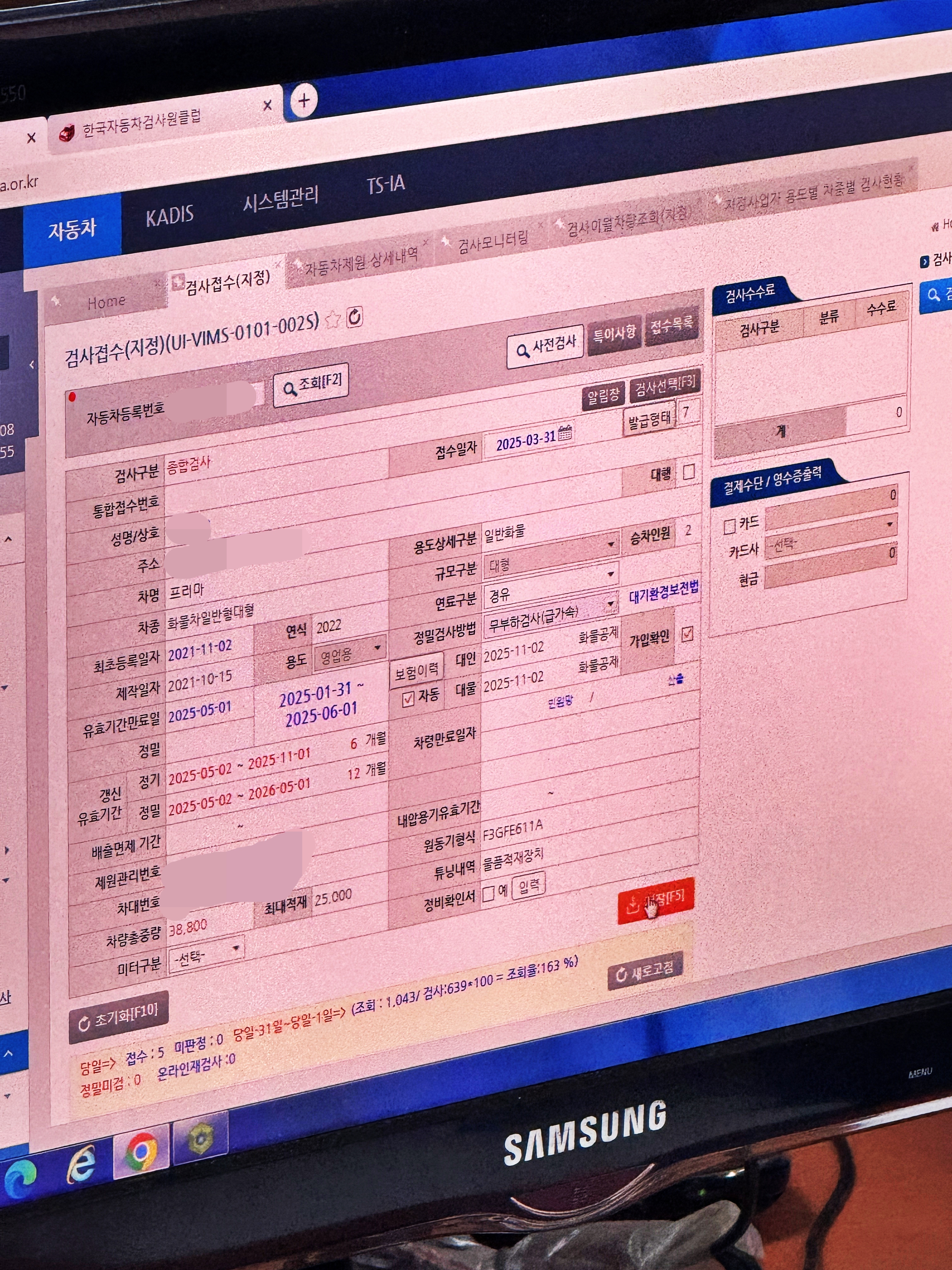 영업용 차량이라 신차 출고 1년 차와 2년 차에는 정기검사를 받습니다만, 2.5년 차부터는 6개월 단위로 종합검사와 정기검사를 번갈아가며 받아야 합니다. 출고 3년 차를 맞이하는 차량인지라 3년