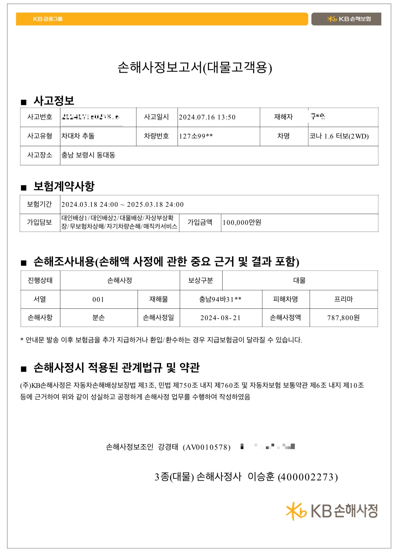 실 수리비는 595,000원. 휴차료는 192,800원이 책정되었습니다. DB손보보다 KB가 많이 주긴 하네요. 그렇게 어제 휴차료까지 입금되었고 완전히 종결되었고 손해사정보고서가 나왔습니다.