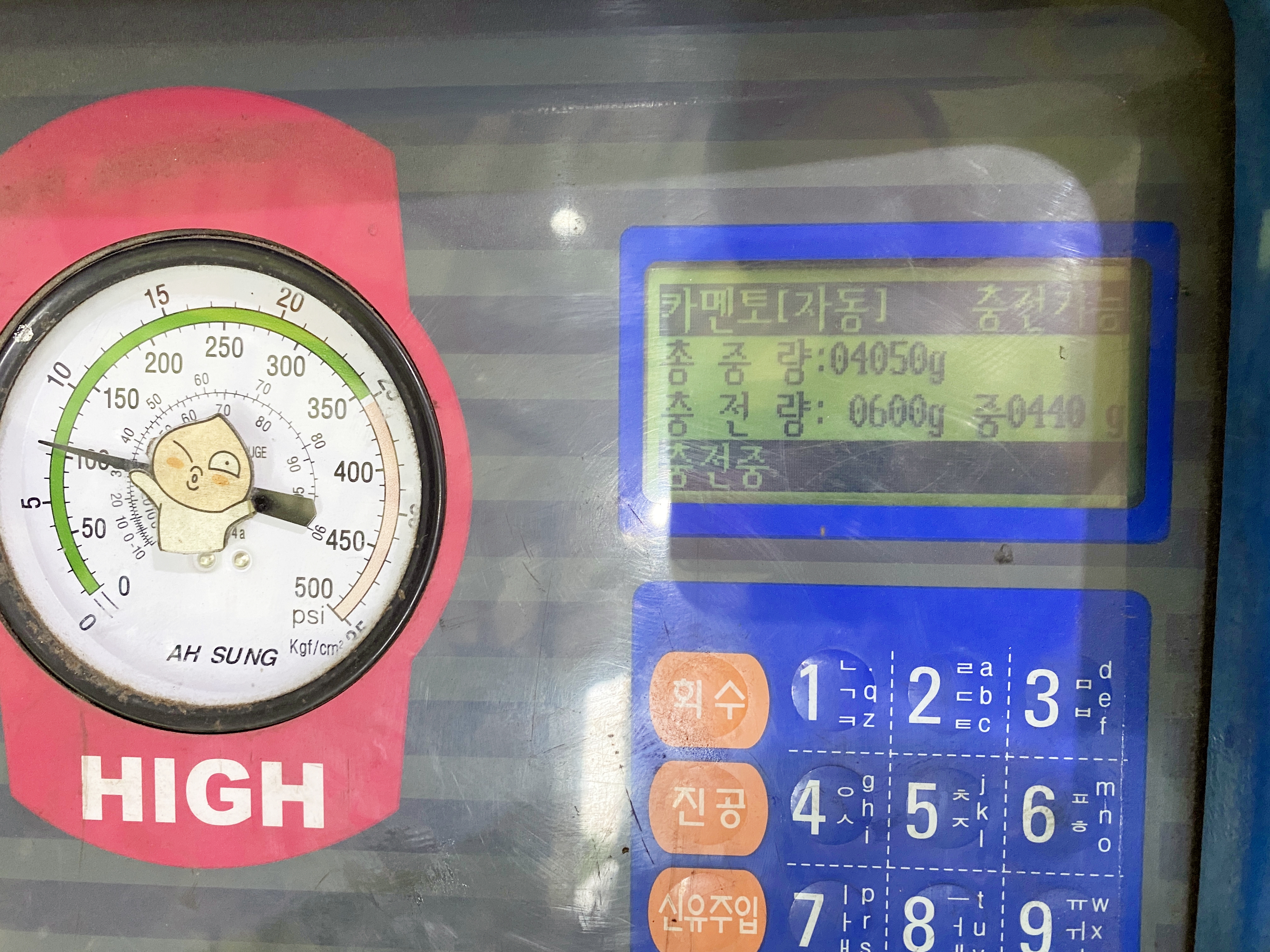 에어컨가스를 충전합니다. 정량은 600g이네요.