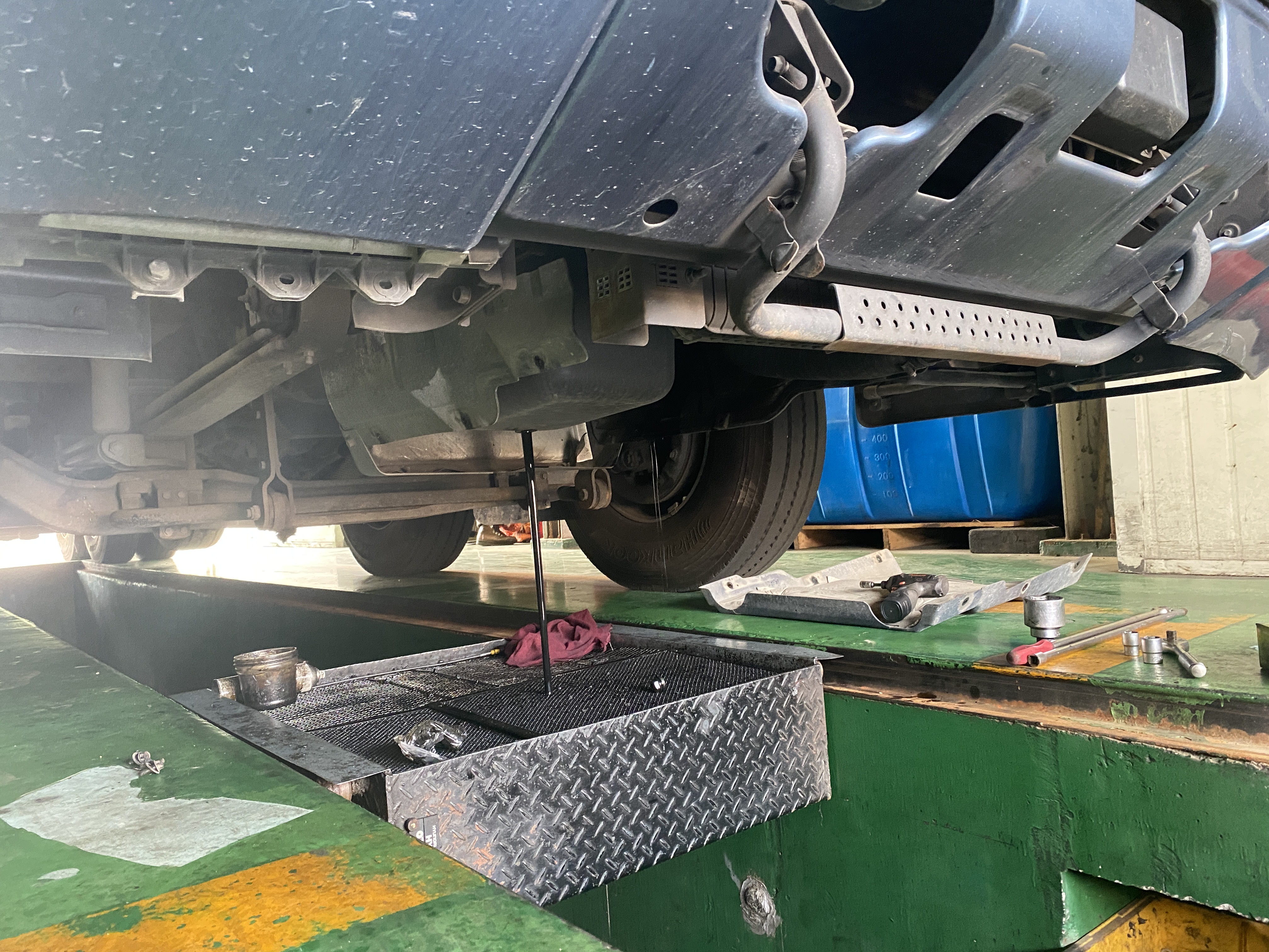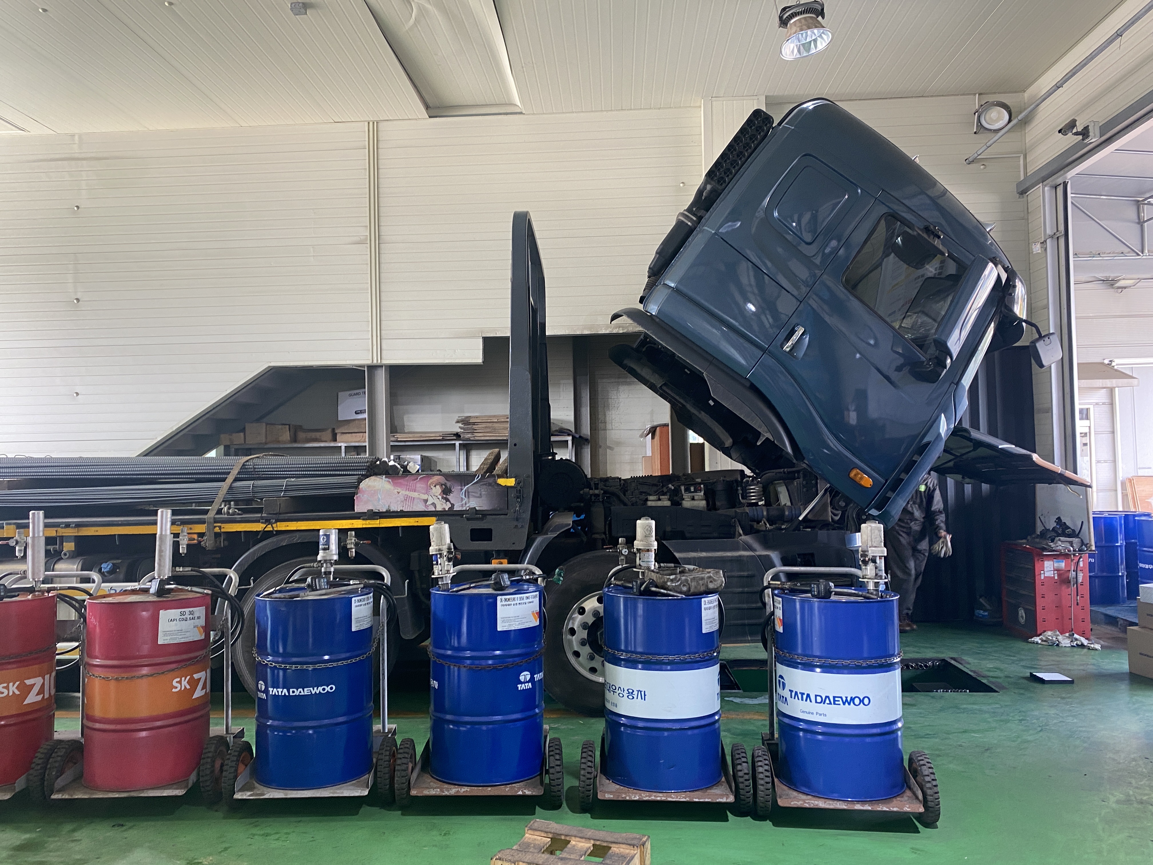 딸깍 딸깍 소리와 함께 엔진오일이 주입됩니다. 단순 오일값만 하더라도 어지간한 국산 승용차에 최고급 엔진오일로 교체하는 총비용보다 더 비쌀 겁니다. 수입 승용차랑 비교하면 그 차들이 센터에서 교체하는 비용이 더 비쌀겁니다.
