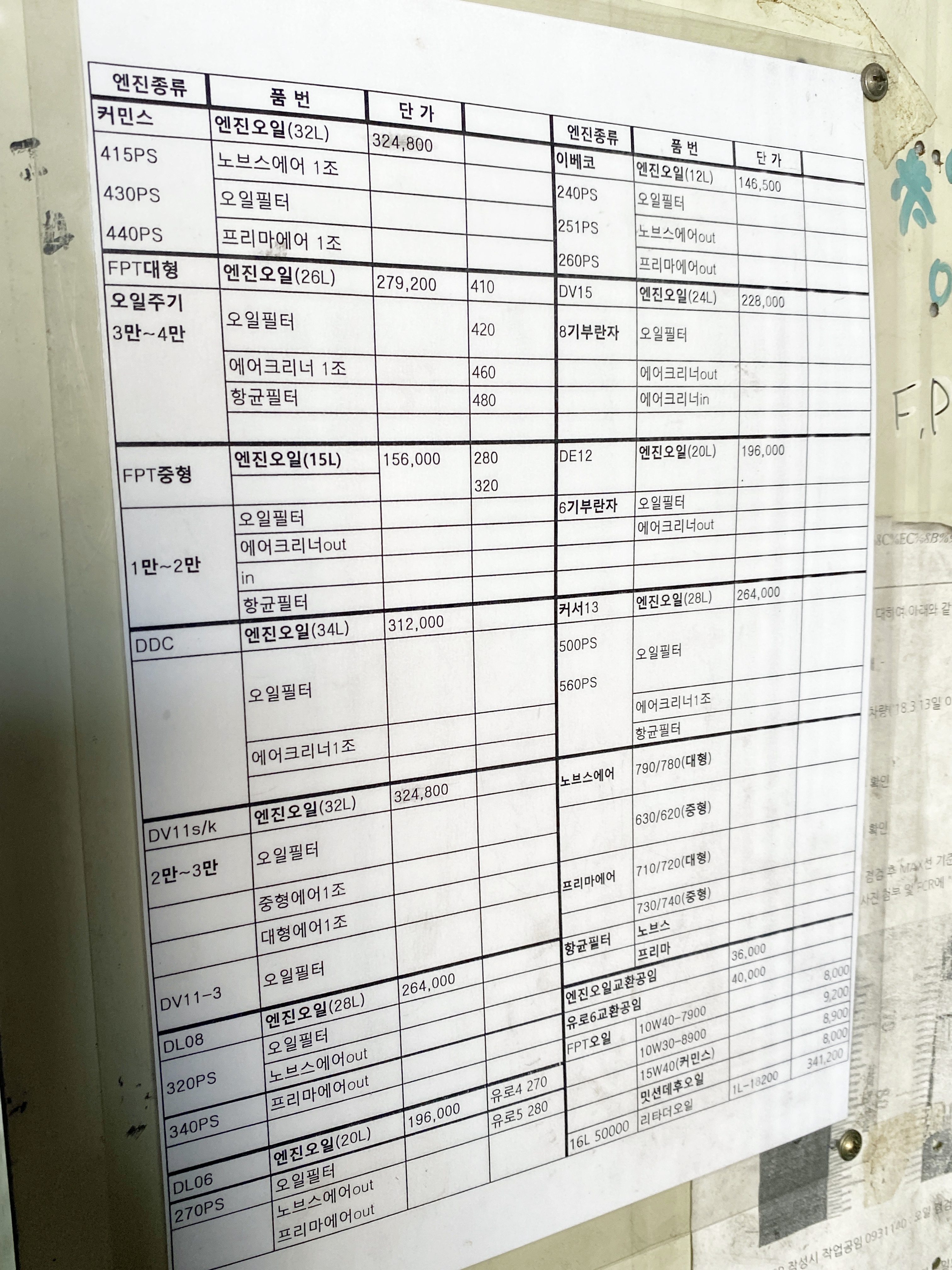 작업장 한켠에 엔진오일 제원표가 붙어있네요.