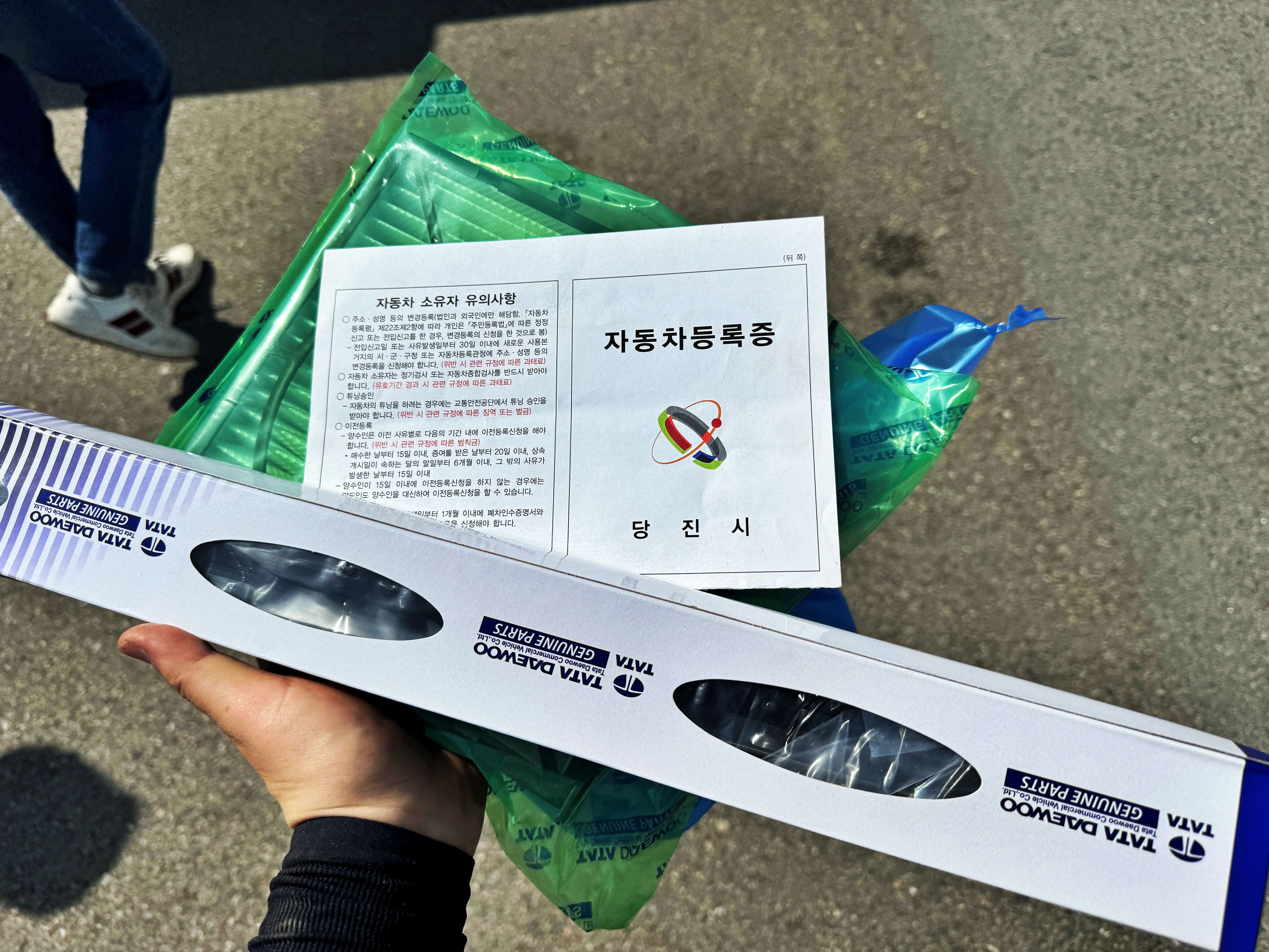 좌측 범퍼 커버가 깨졌고, 우측 후미등 렌즈에 살짝 크랙이 있다는 사실을 알려줍니다. 커피를 마시며 잠시 기다라고 하시네요. 그러며 등록증과 함께 두 종류의 소모품을 주십니다. 막상 와보니 새차보단 오래된 차량들에게 엄청난 이득인 행사로 보이는군요. 더쎈 신형을 타고 오신 분은 딱히 고쳐줄 부품을 가져오지 않았다고 하여 소모품만 받고 간단한 점검만 하고 그냥 가셨습니다.