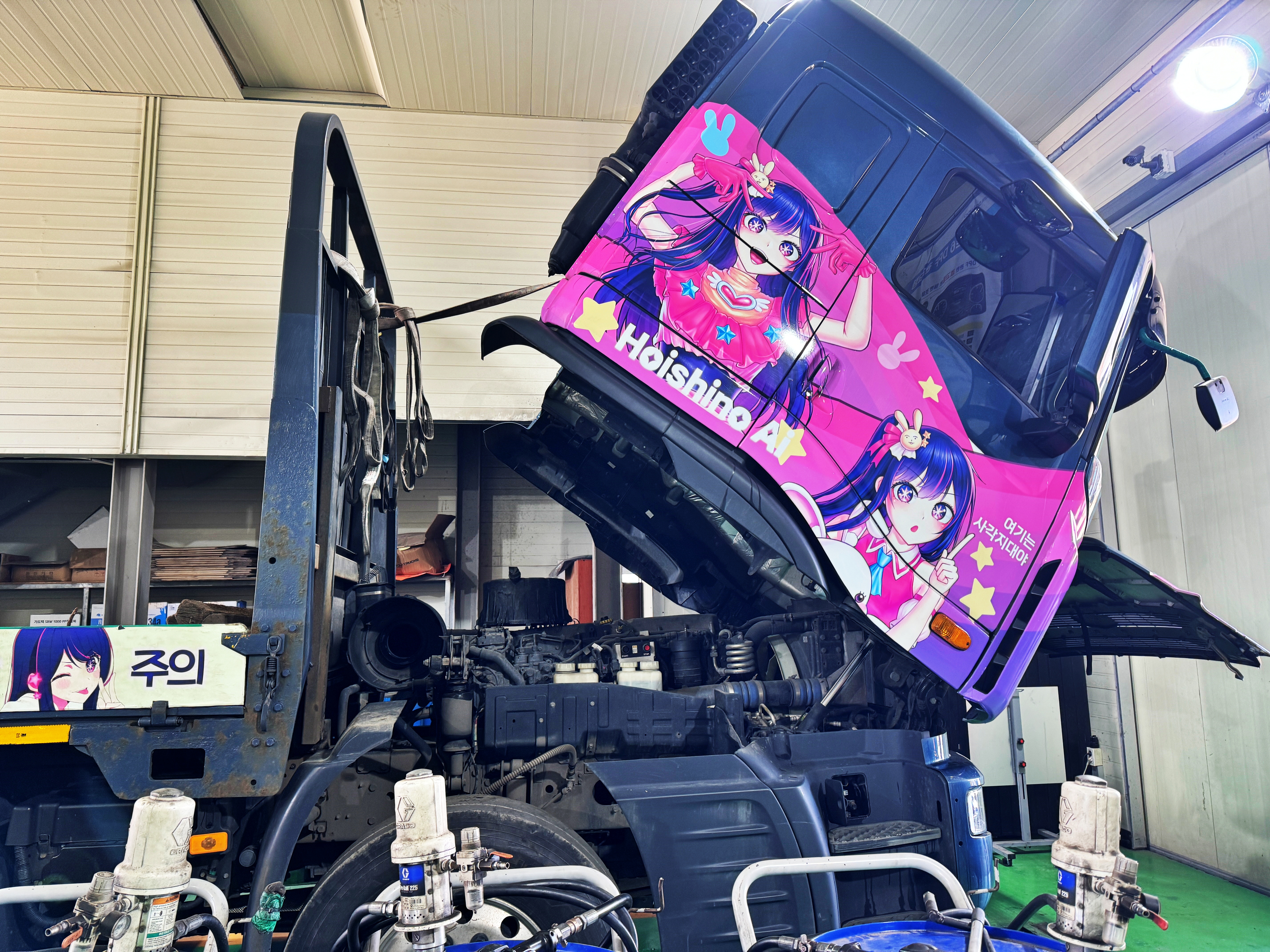 입고 후 탑을 들어줍니다. 적재함 앙골대에 걸어둔 슬링바 하나가 흡기라인에 걸려서 저리 되어버렸네요. 빠지지도 않습니다. 나중에 봐서 끝을 잘라내던지 해야 합니다. 그래도 탑을 드는데엔 큰 문제는 없어 계속 진행합니다.