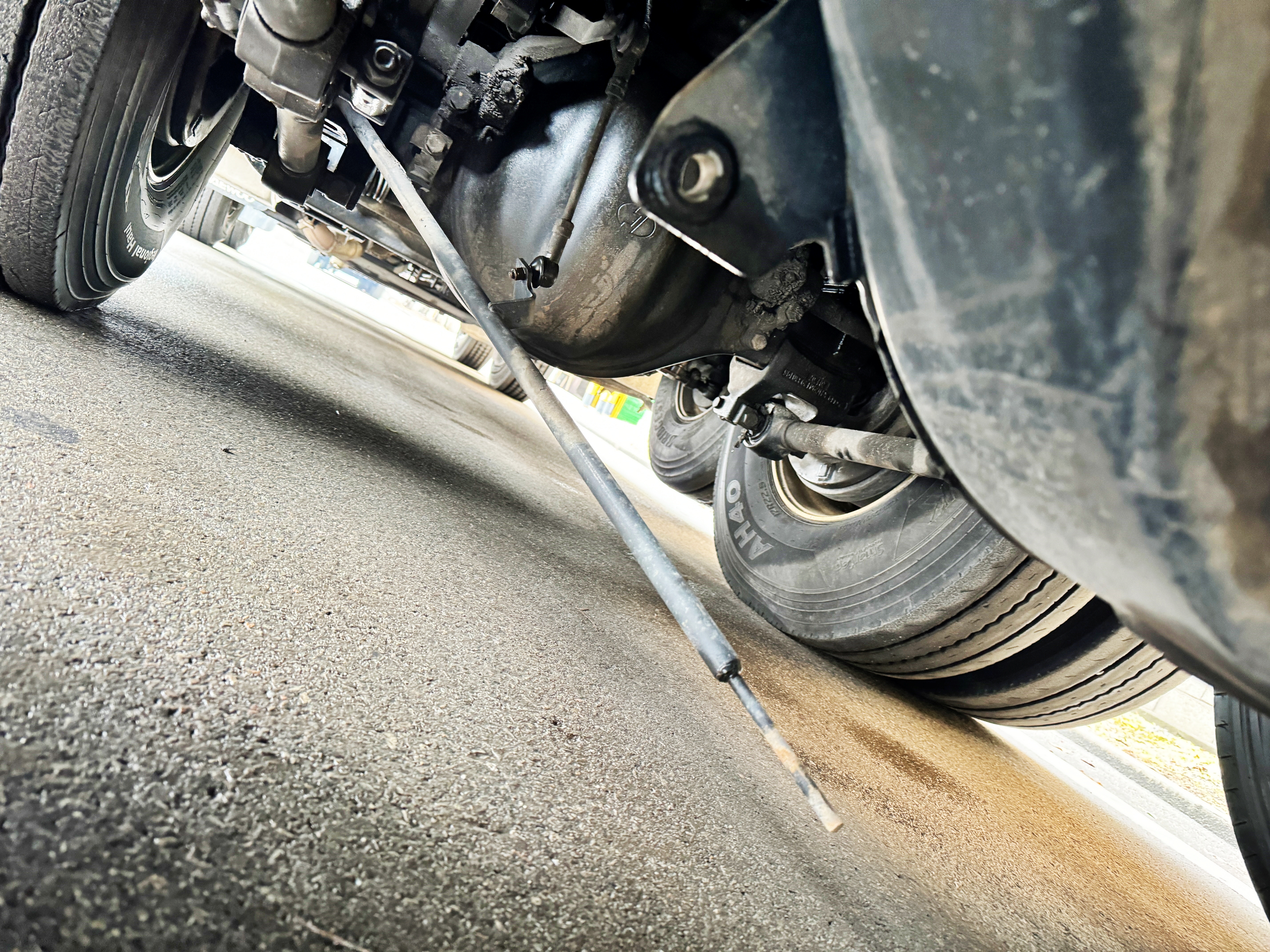 설 연휴를 며칠 앞두고 있던 시점 상차는 더럽게 안되고 있었는데 차를 살피다 4축과 5축 사이에 무언가가 빠져있는 모습이 보였습니다. 이날 아침에 시동을 걸고 보니 갑자기 에어도 거의 다 빠져있었던지라 다녀와서 센터에 입고해야지 했었는데 급히 입고를 시켰습니다.