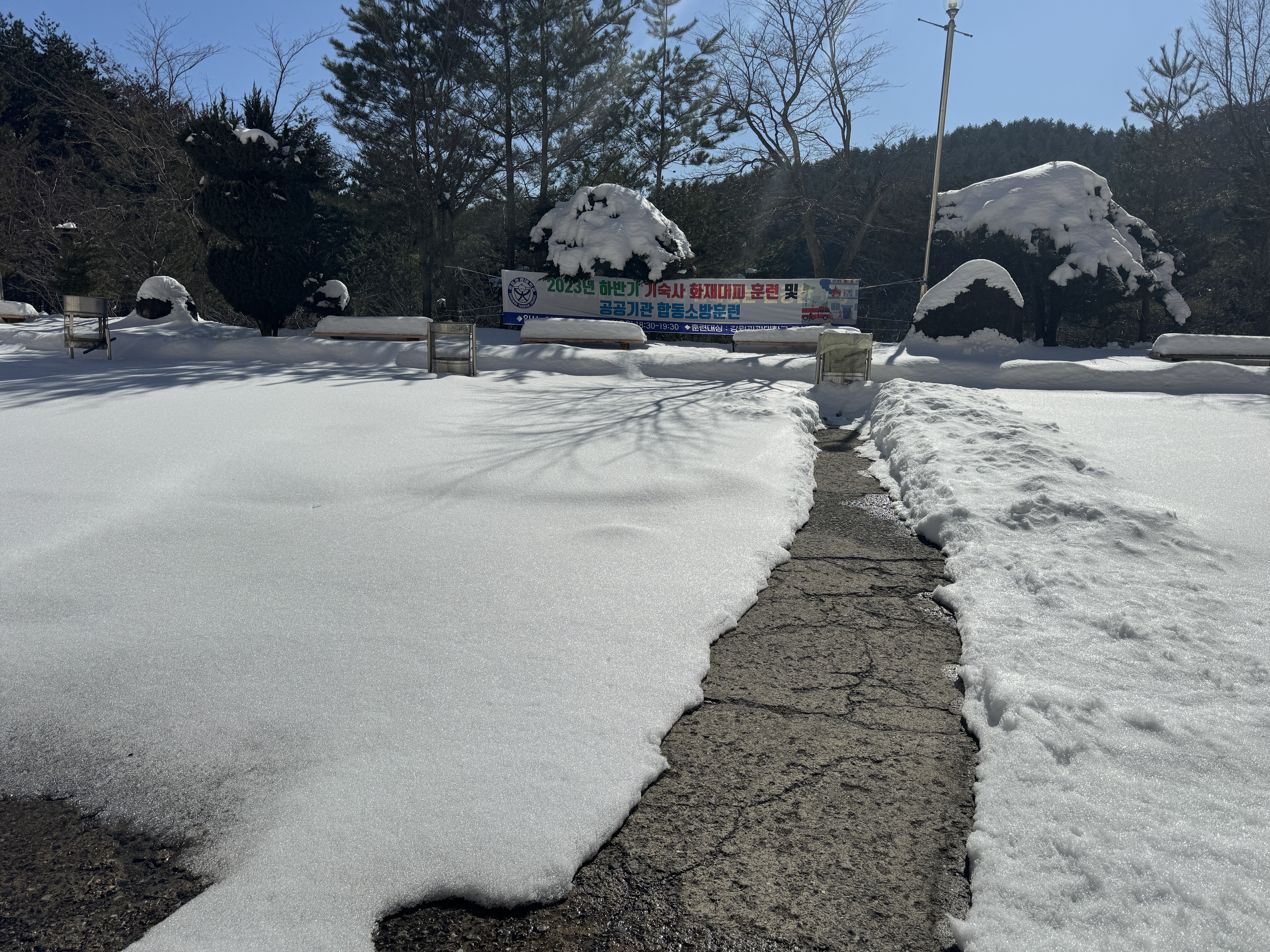 휑~합니다. 국기게양대에 걸린 국기도 없고요. 웅비관에서 봤던 제설도구도 보이지 않습니다. 출입구 앞으로 가까이 다가가 봅니다.