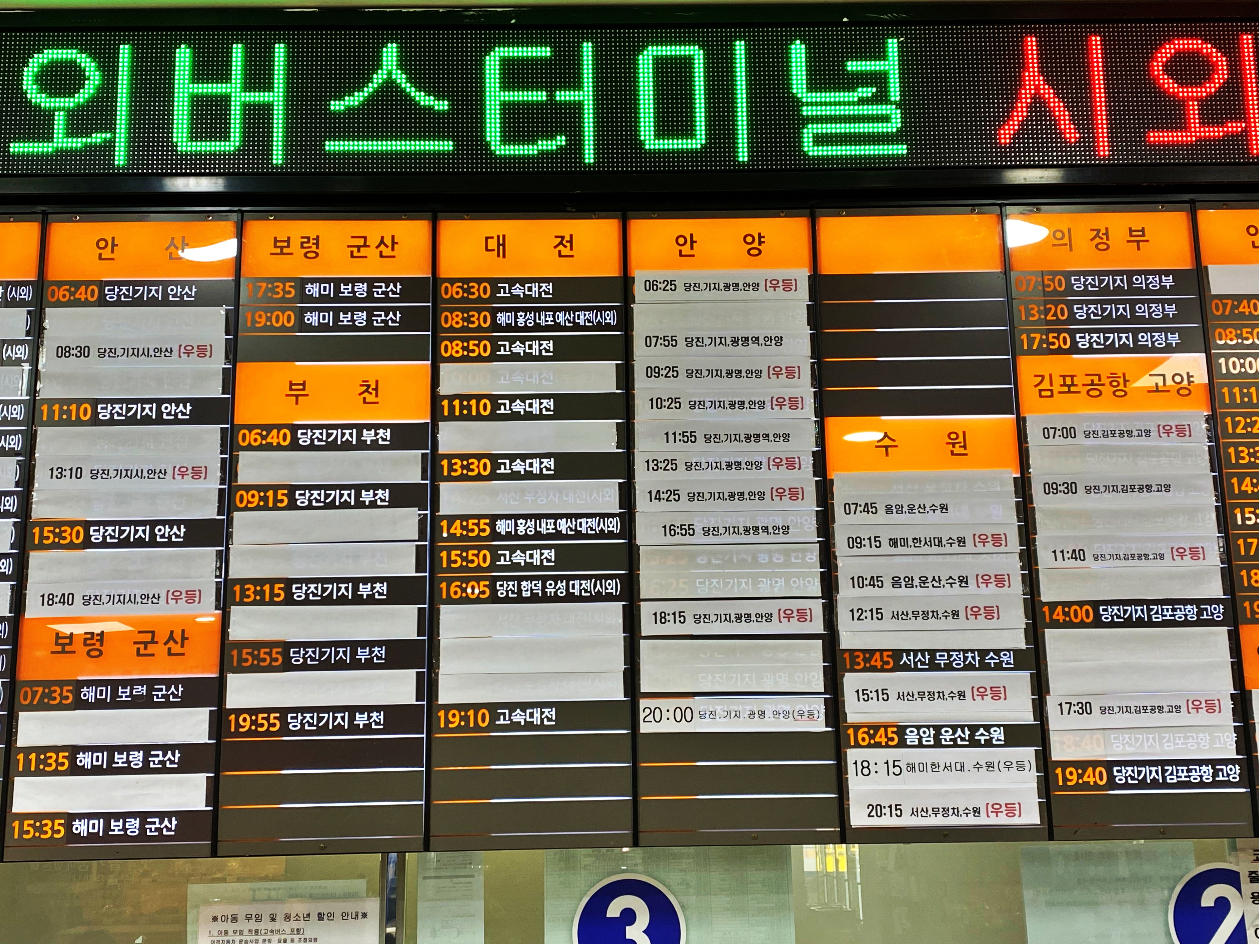 안산행, 보령경유 군산행, 부천행, 대전행 안양행, 수원행, 의정부행, 김포공항 경유 고양행 시간표입니다.